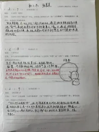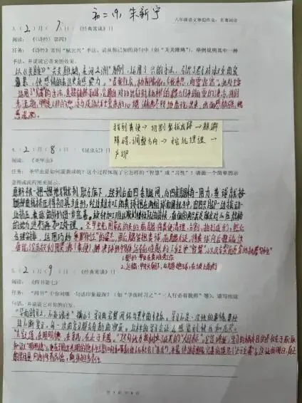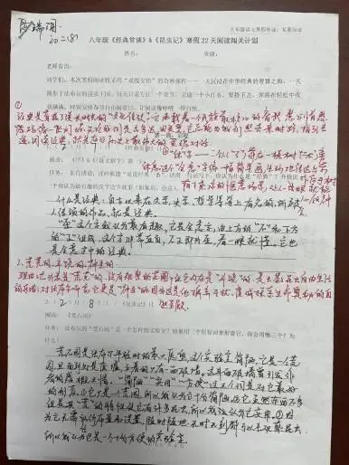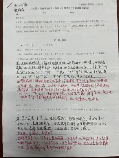 文韵润心,诵典知味。这个寒假,初二学子深耕文言经典与科普名著,将八下背诵篇目、课外古诗词的笔墨默写凝于新本,字字工整见功底;以22天阅读闯关为契,在《经典常谈》中触摸中华文脉,在《昆虫记》里探寻自然奥秘,读书笔记中,或圈点批注,或抒写感悟,让阅读的思考落地生根。笔尖流转间,是对文字的敬畏,更是对知识的求索。