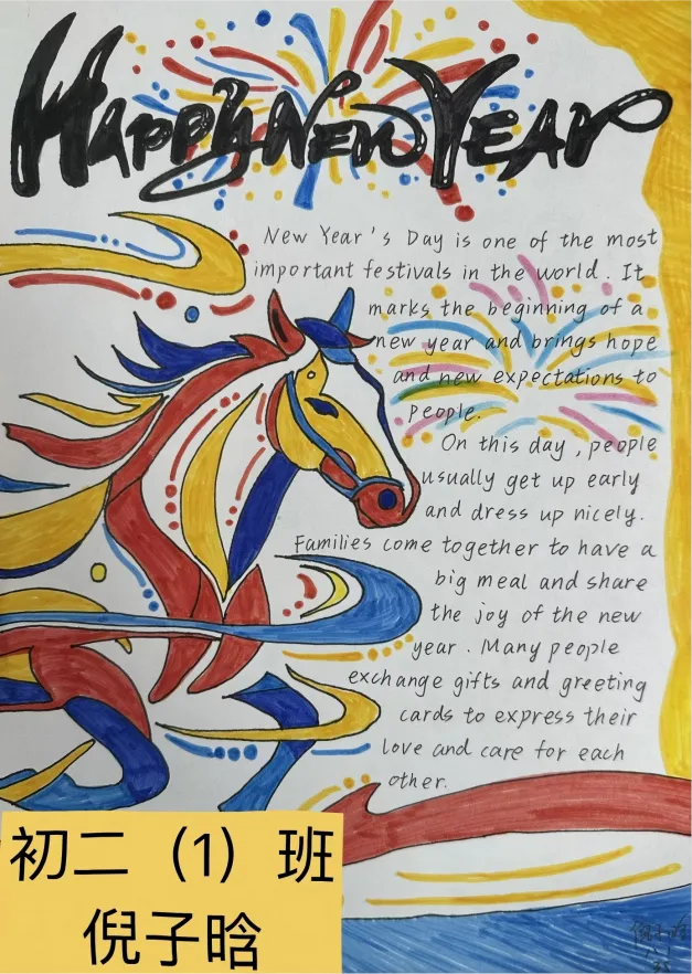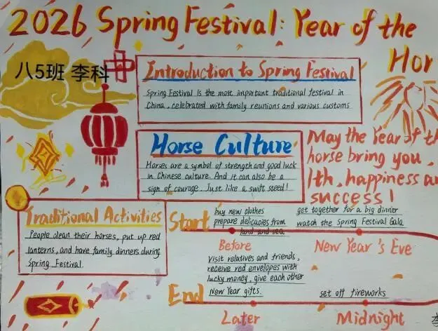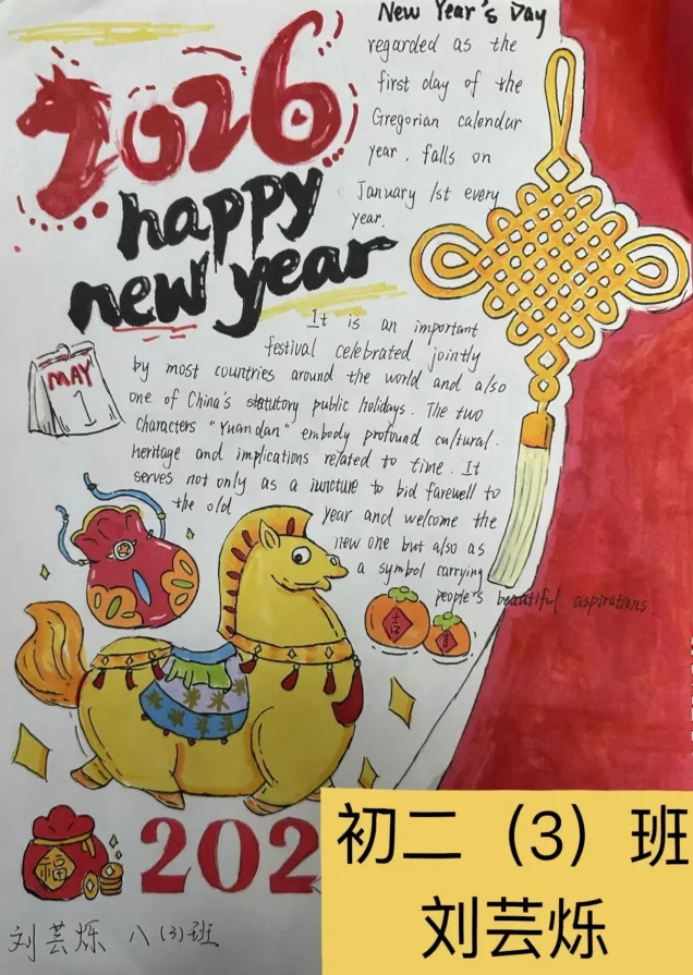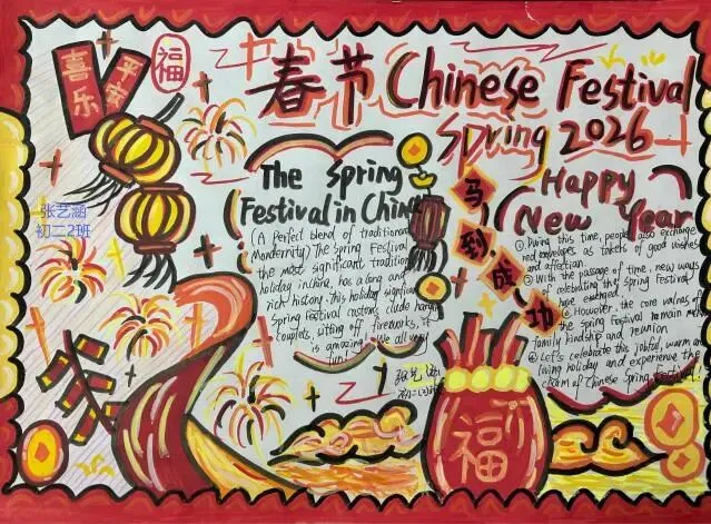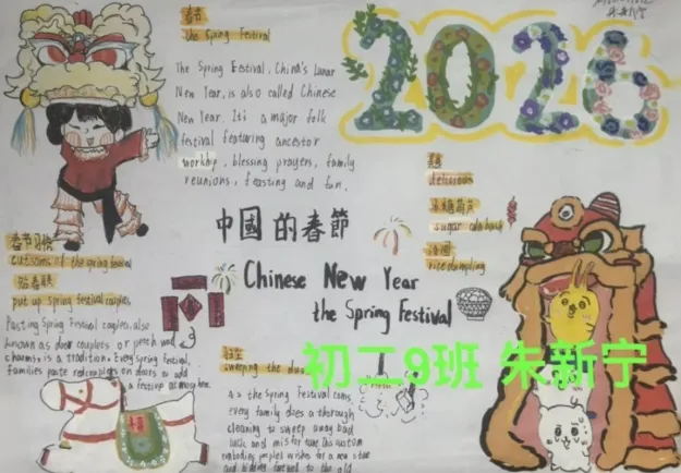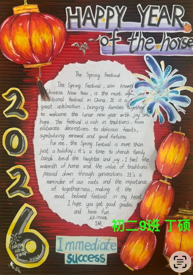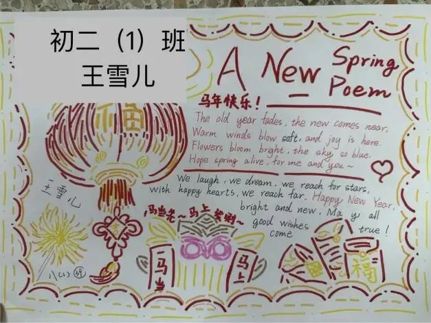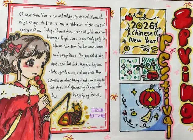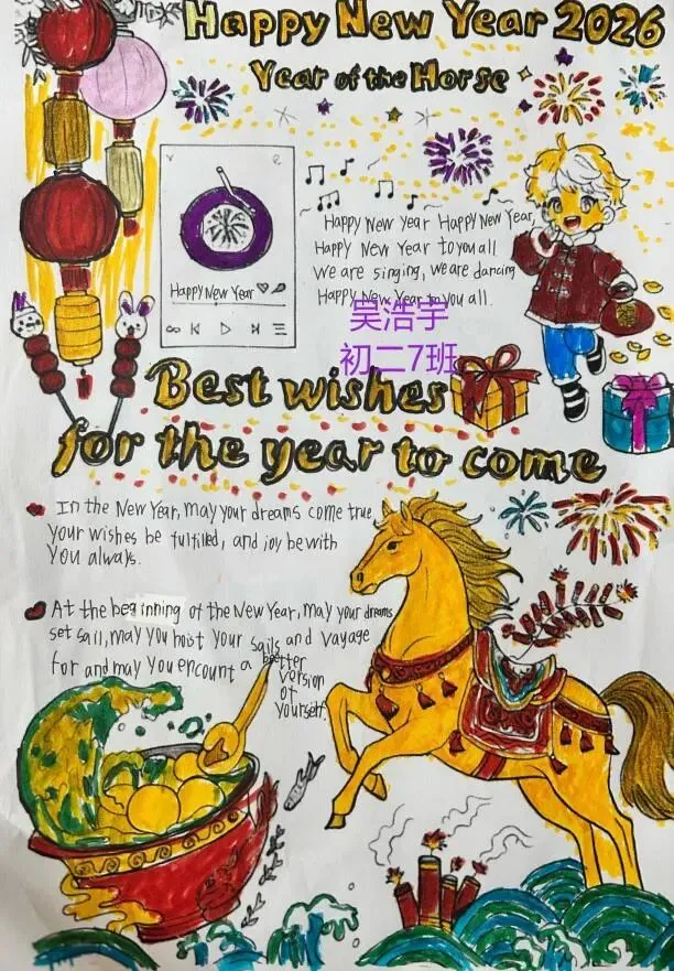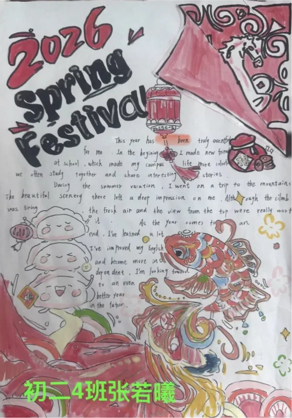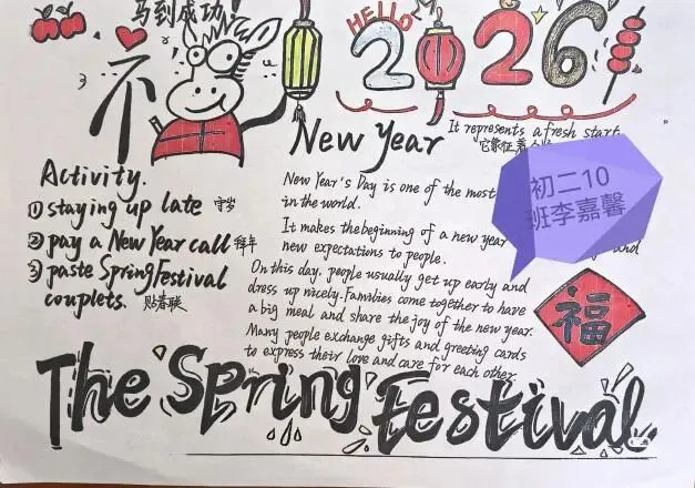 晨读暮记,语通世界。初二学子的英语寒假,在单词的抄写默写、课文的朗声诵读中夯实基础,八下单词的反复书写、过去式与过去分词的精准掌握,是攀越语言高塔的坚实足印;创意满满的英文新春海报,将中西文化相融,让英语表达有了别样的创意光彩。