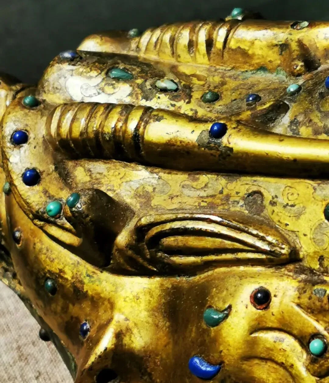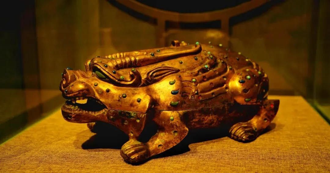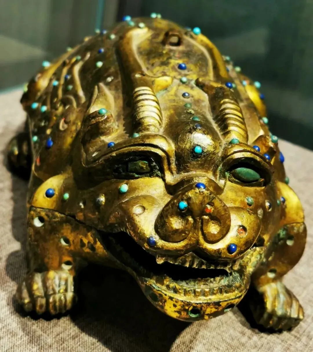 • 工艺极致:盒身满饰鎏金银,表面均匀镶嵌绿松石、青金石、玛瑙、琉璃珠等各色宝石,在灯光下流光溢彩,尽显东汉贵族的奢华审美。兽首下颌前伸,巧妙构成储水墨池;盒盖与盒身以子母口相合,内部嵌有椭圆形石砚与磨砚小圆石,设计精巧,实用性拉满。