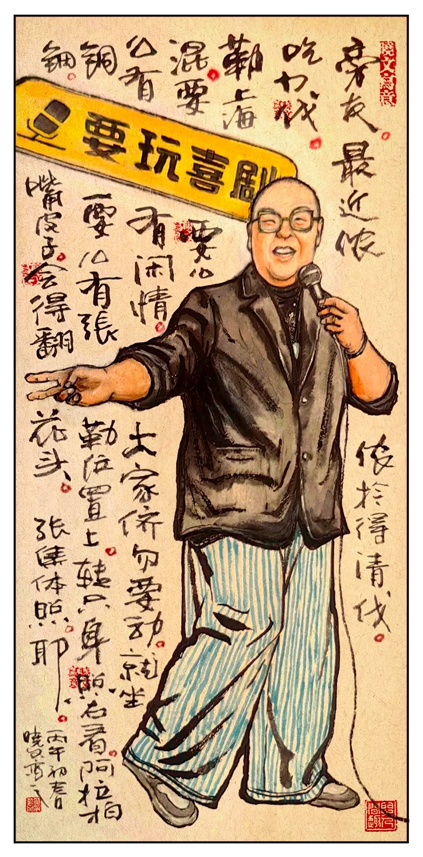 台上挂勒块明黄色的招牌,“要玩喜剧”四个黑字,弹眼落睛。