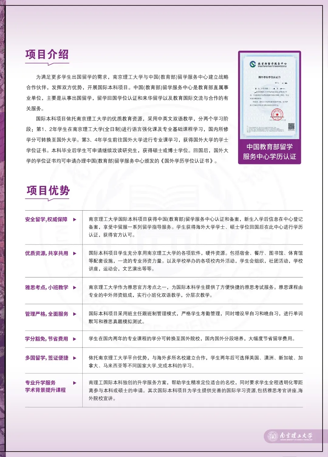 南京理工大学是隶属于工业和信息化部的全国重点大学 ,有着深厚的历史底蕴和强大的师资力量。其国际本科项目与中国(教育部)留学服务中心建立战略合作伙伴关系 。新生入学后信息在中心登记备案,中国(教育部)留学服务中心会对项目予以政策性指导并提供相关服务,为符合条件的学生提供学历学位认证等服务,所以项目正规性和可靠性无需担忧。