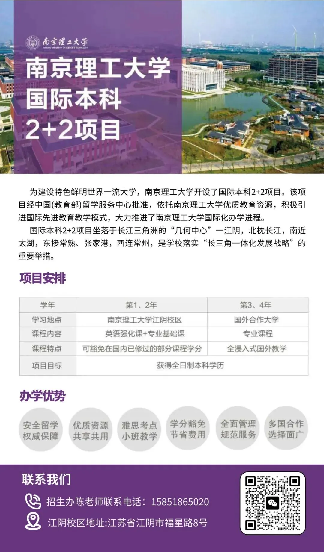 目前,南京理工大学已启动2+2国际本科项目的招生工作,合作方向涵盖英、澳、新等多个主流留学国家。所对接院校均完成教育部留学服务中心备案,毕业所获学位可申请国内学历认证。如果还有疑问,欢迎扫描下方二维码添加招生老师进一步咨询。