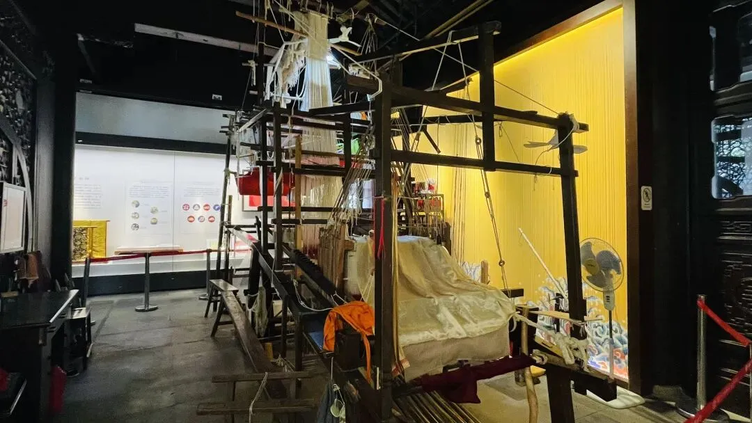 博物馆中展出很多南京非遗项目,集中呈现南京白局、秦淮灯彩、南京云锦、金陵刻经、绒花、竹刻等;有传承人现场演示、手工体验课。这是云锦织机,后来在明孝陵博物馆看到工人在织锦。一人坐在上面理经线,一个坐下面织纬线,采用的也是通以断纬的方式,细看之下我觉得没有缂丝精细。