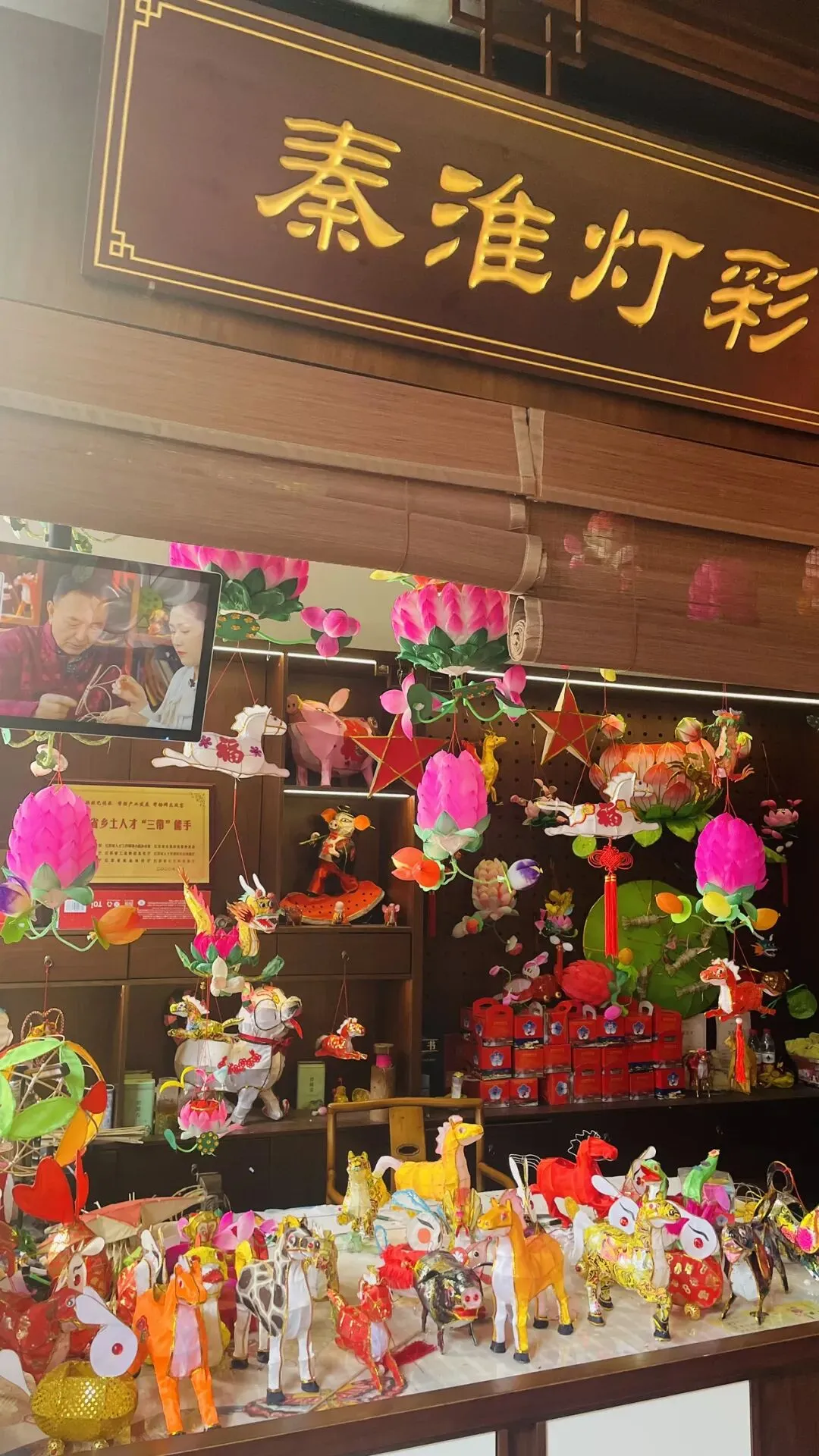 这是秦淮灯彩,又称金陵灯彩、南京灯彩,是南京代表性民间灯艺,为国家级非物质文化遗产,与秦淮灯会紧密结合,有秦淮灯彩甲天下的美誉。秦淮灯彩起源于东吴,六朝兴起,明代朱元璋定都南京时将元宵张灯延至十夜,达鼎盛;东晋已有文献记载,至今1700余年历史。在工艺上,集编扎、绘画、剪纸、彩绘等多门手艺,以竹篾做骨架,糊彩色纸/丝帛,传统为烛火,现多用电动光源;经典荷花灯要经62道工序。传统灯型有八绝:荷花灯、兔子灯、飞机灯、狮子灯、花篮灯、金蟾灯、开瓜见子灯、麒麟送子灯。