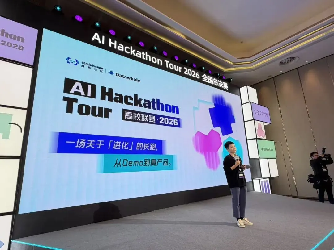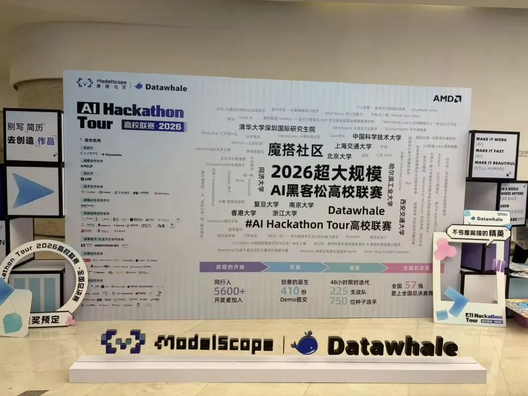 AI Hackathon Tour高校联赛由中国最大的模型开源社区魔搭社区ModelScope与AI开源学习社区Datawhale联合发起,是业界顶尖AI人才的尖峰对决。