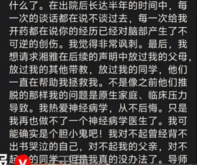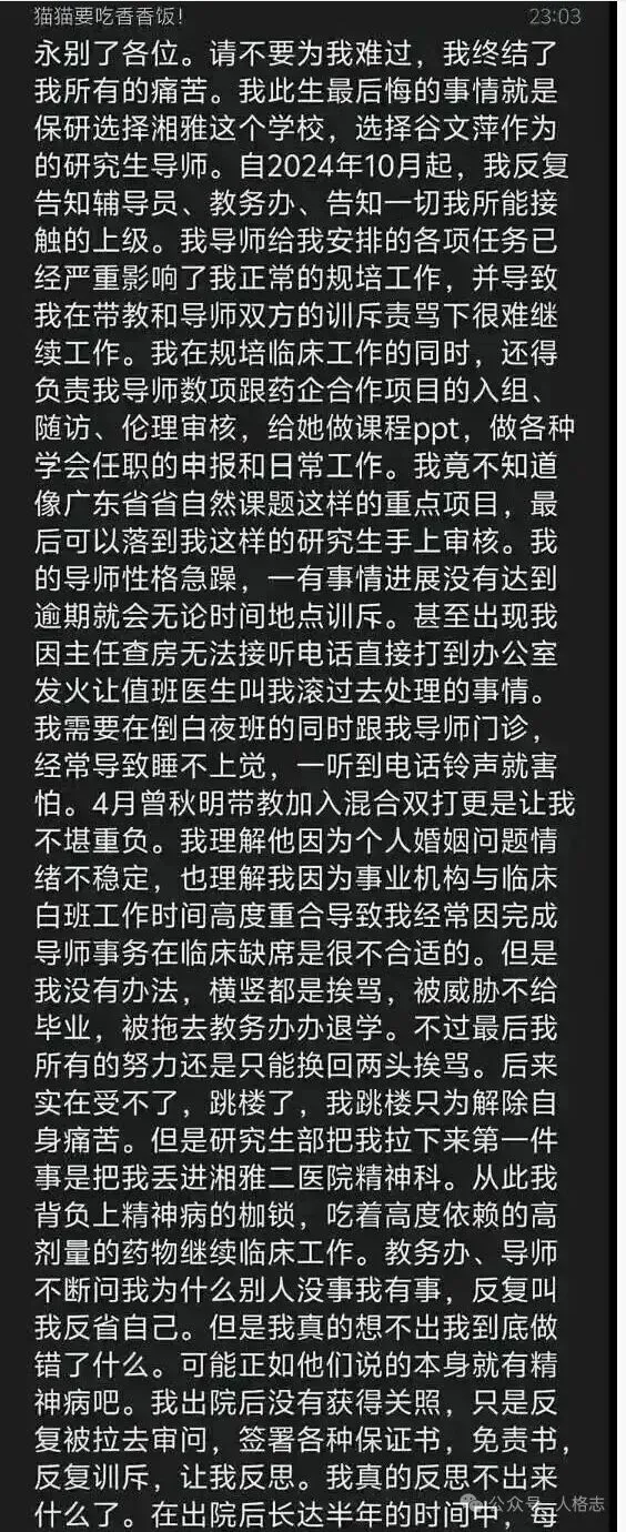她死前留下了长长的遗书,称“我此生最后悔的就是保研选择湘雅这个学校,选择谷某某作为研究生导师……”