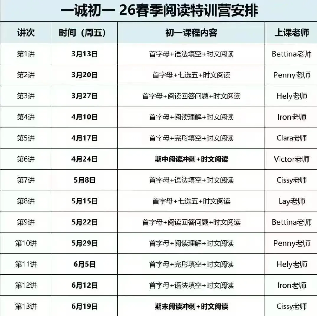 南京家长口碑炸裂的英语提分课,专为初一孩子定制,春季提分黄金期针对初一英语阅读痛点,从基础到进阶层层突破,兼顾应试能力与学科素养,帮孩子轻松拿高分!1. 专项突破:从首字母填空到各类阅读题型,逐一拆解解题思路,告别盲目刷题2. 高效训练:时文阅读+专项练习,贴合考试趋势,提升阅读速度与准确率3. 冲刺赋能:专属期中/期末冲刺模块,考前精准查漏补缺,快速提分4. 名师护航:金牌名师团队坐镇,经验丰富、课堂高效,手把手教解题技巧每周1次固定打卡,帮助孩子摆脱拖延,建立规律阅读模式,长期积累稳步提升!初一英语阅读是基础,春季衔接课内知识与应试考点,正是夯实能力、突破分数的黄金阶段。错过本期,再等半年!英语阅读想提分、攻克首字母填空、冲刺期中/期末高分的孩子