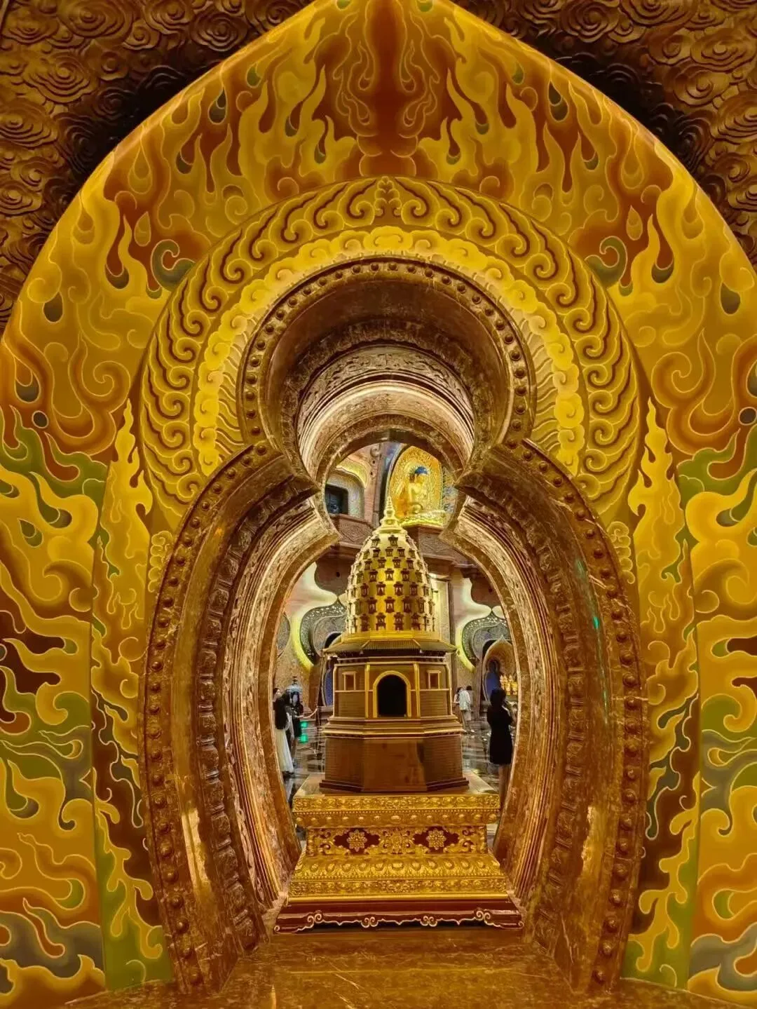 中间高达21.8米的舍利大塔金碧辉煌。