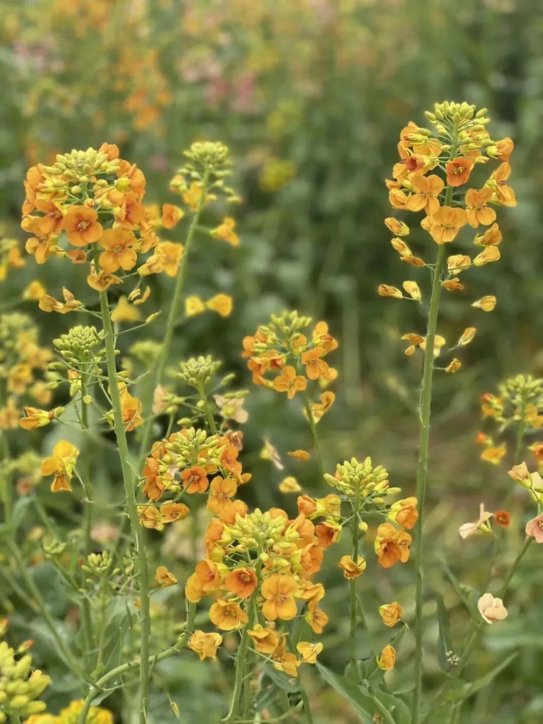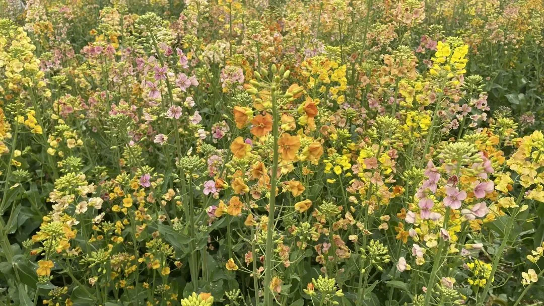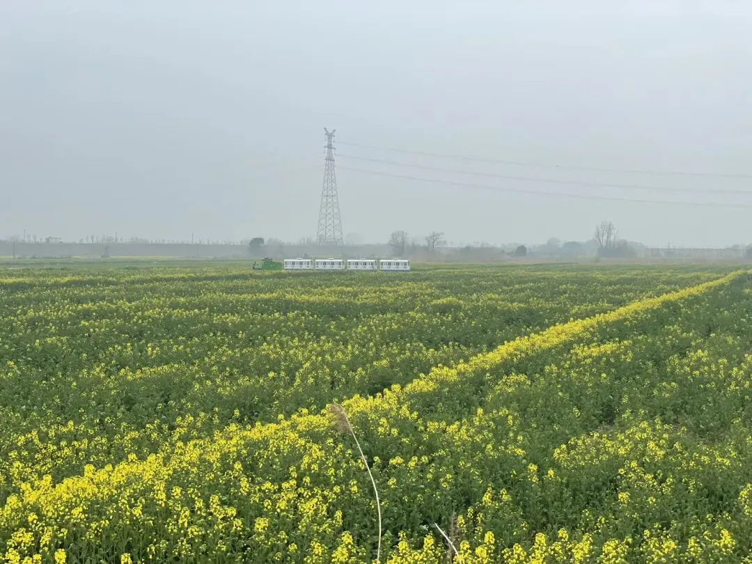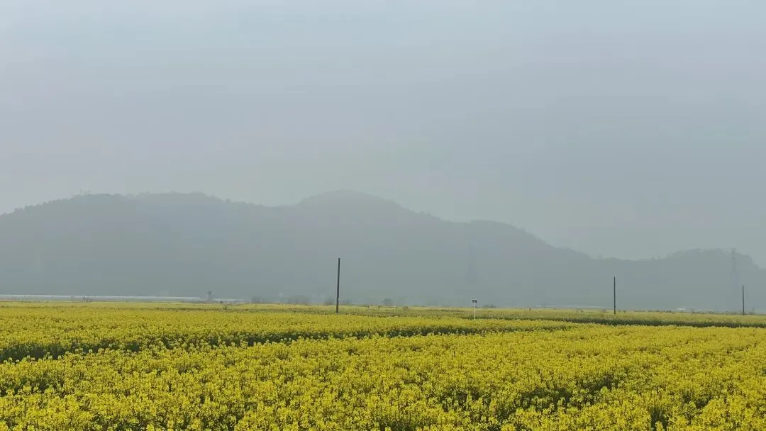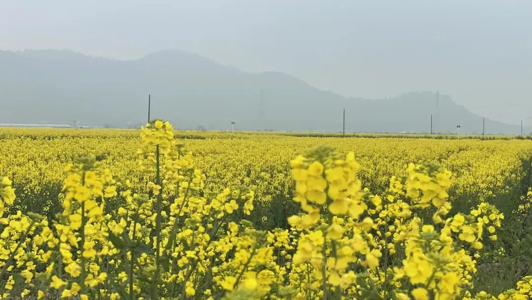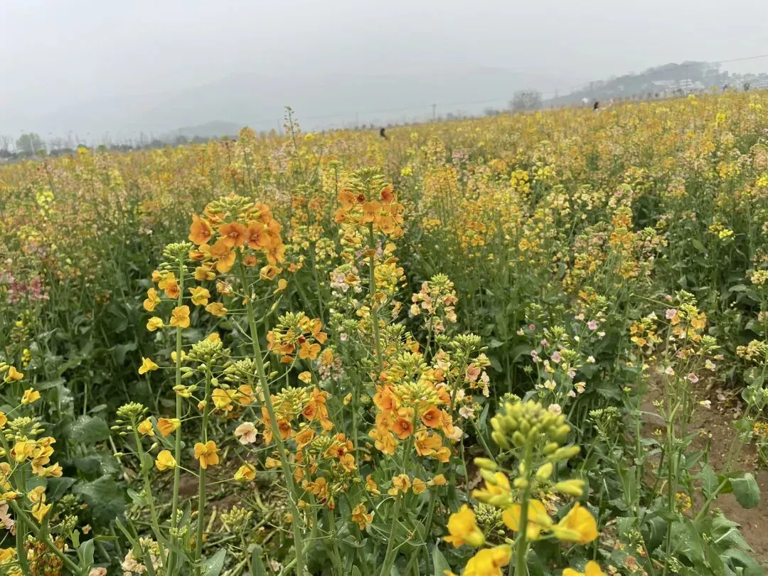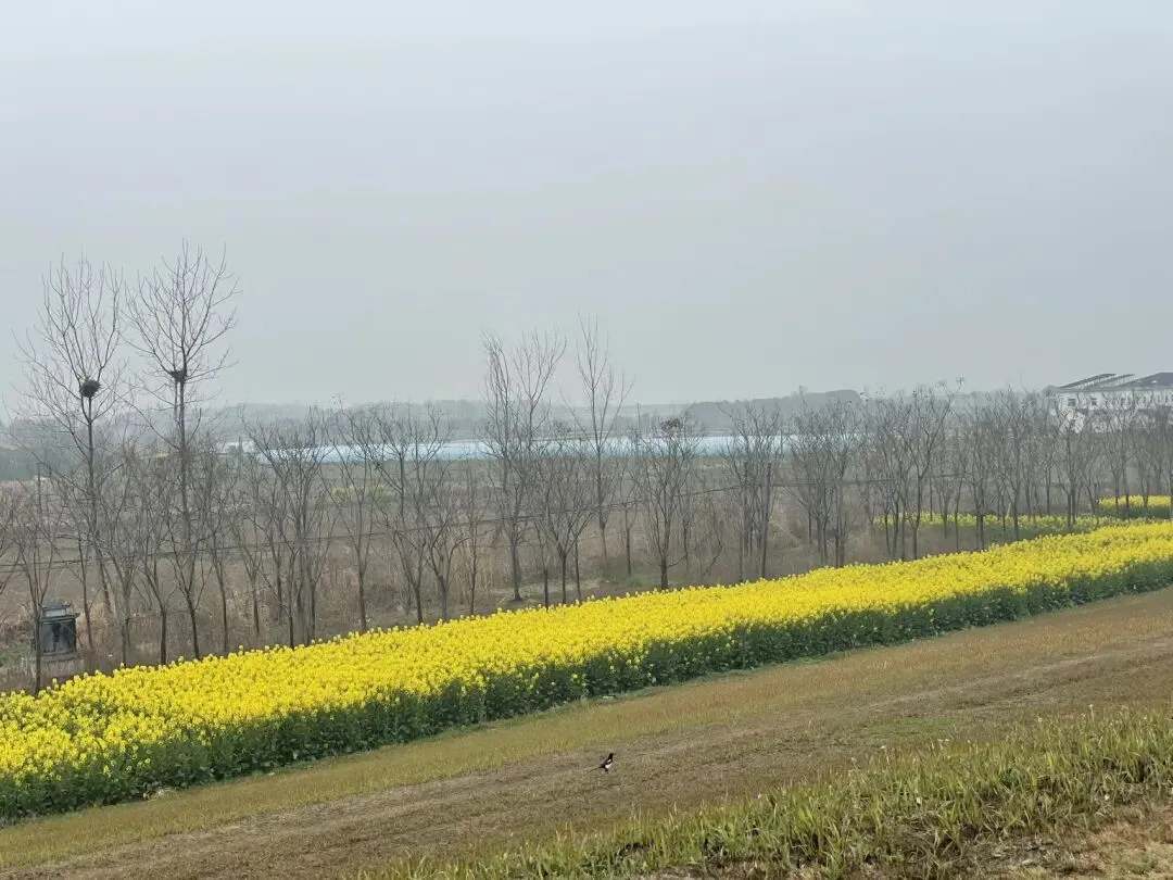 沿河堤而行,漳河在身旁静静流淌。河堤两侧枯草泛黄,透出秋冬的余韵,而金黄的油菜花却又在春寒中绽放,奏响春天的圆舞曲。宽阔的河面雾气氤氲,对岸的树木轮廓模糊,宛如水墨渲染。这里没有人烟,但却是鸟类的天堂,白鹭的翅膀剪开低垂的水雾,野鸭在浅滩拨动青灰色的涟漪,肥胖的喜鹊从枯草丛中“扑棱棱”惊起,啼鸣把寂静拉得更深更长。可惜我的手机无法拍下如此热闹的景象。 前行不久,便至石硊古渡。这里曾是漳河上的重要渡口,杨万里笔下“斜风细雨寒芦里,下有深潭黑无底”的险峻,如今已化为一片宁和。王维歌咏的“欲归江淼淼,未到草萋萋”却至今犹存。河滩上,老牛卧成一块温润的岩石,任羽翼鲜亮的翠鸟停在脊背上歇脚,待我拿出手机,那翠鸟却又扑棱棱飞走了。火车在不远的高架桥上划过,那声响刚触及水面,便被风与鸟鸣揉散。 在河堤上可以设置导航“石硊桥-道路 芜湖市”,抵达石硊桥后,百度导航:山湖村 芜湖市弋江区,选择“不可走”的这条线路,很快就可以抵达山湖村,这条路其实是可以通行的。 这里是“梦开始的地方”,倏然间,一片灿烂的金黄涌入眼帘,油菜花田到了!花海广袤无垠,明艳的黄色花朵如波涛般起伏,花田中穿行着彩色的小火车,远处电塔耸立,天空灰白薄雾,勾勒出乡村田园的宁静画卷。这里没有城市的喧嚣,只有花香弥漫、蜂蝶轻舞,让人心旷神怡。 从山湖村出发,百度导航:响水涧 芜湖市弋江区,选择“不可通行”道路,沿线均是纵横的水网和连片的油菜花田。终点响水涧的花田则不再是单一的金黄,而是缤纷的色彩交织。橙黄、粉色的花朵簇拥绽放,如调色盘洒落田野。近观花朵,花瓣精致,茎秆挺拔。这片彩色花海,如同大地的刺绣,在灰蒙春色中格外亮眼,吸引我们驻足流连。