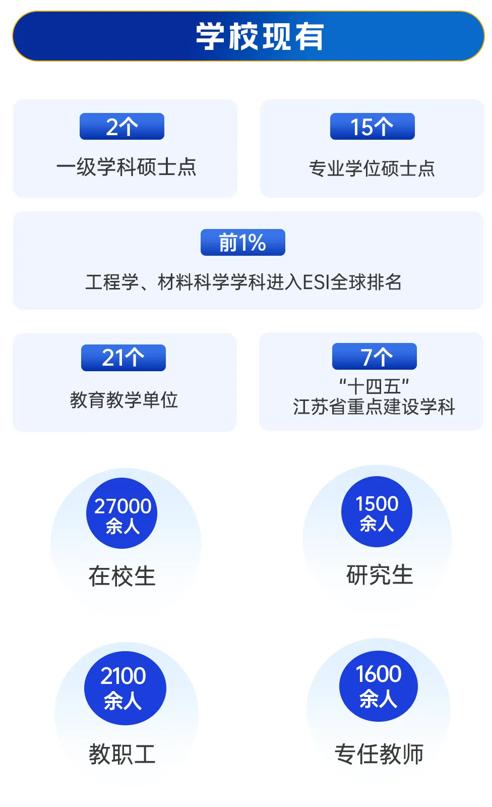 经过多年的建设发展,学校构建了以工学为主,经济学、管理学、文学、理学、法学、艺术学等协同发展的学科体系。现有“十四五”江苏省重点建设学科7个,2个一级学科硕士点,15个专业学位硕士点。工程学、材料科学学科进入ESI全球排名前1%。现设有21个教育教学单位,在校生27000余人,其中研究生1500余人。现有教职工2100余人,其中专任教师1600余人。学校在机械、电力、能源动力与核工业等领域具有广泛影响力,为国家和经济社会发展培养了以中国工程院沈国荣院士为代表的28万余名工程技术人才和管理人才。