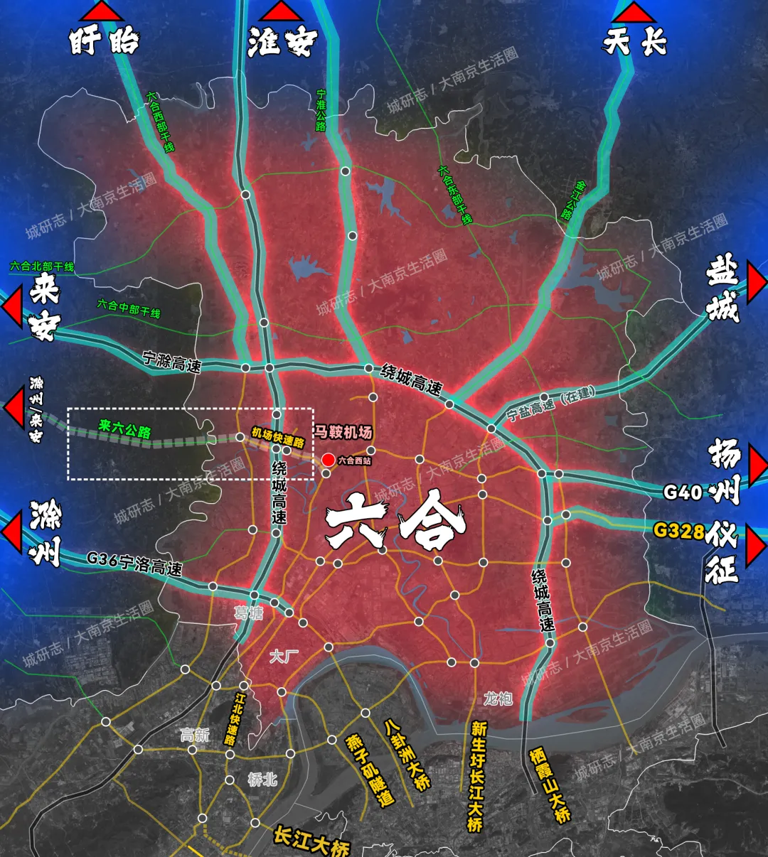 长江以北的西、北、东三个方向,几乎所有城市与南京的车行交通对接都要经过六合,可见六合在南京北部的核心枢纽地位。