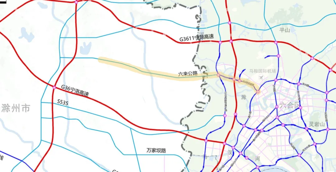 而这次规划出现了另一条连接滁州与六合的通道,机场快速路向西分别与南京绕城高速和西部快速干线相交,然后继续向西与规划的