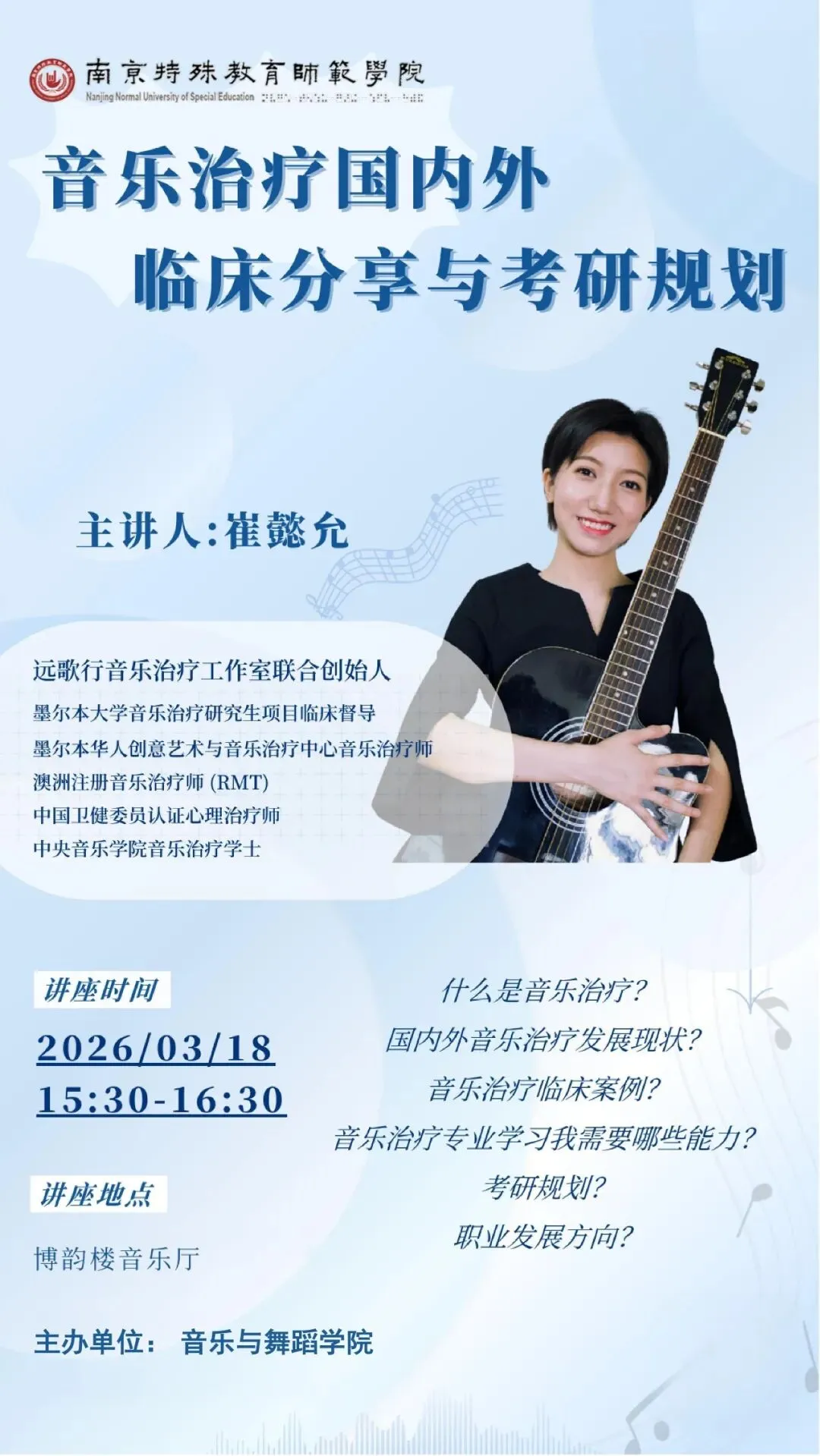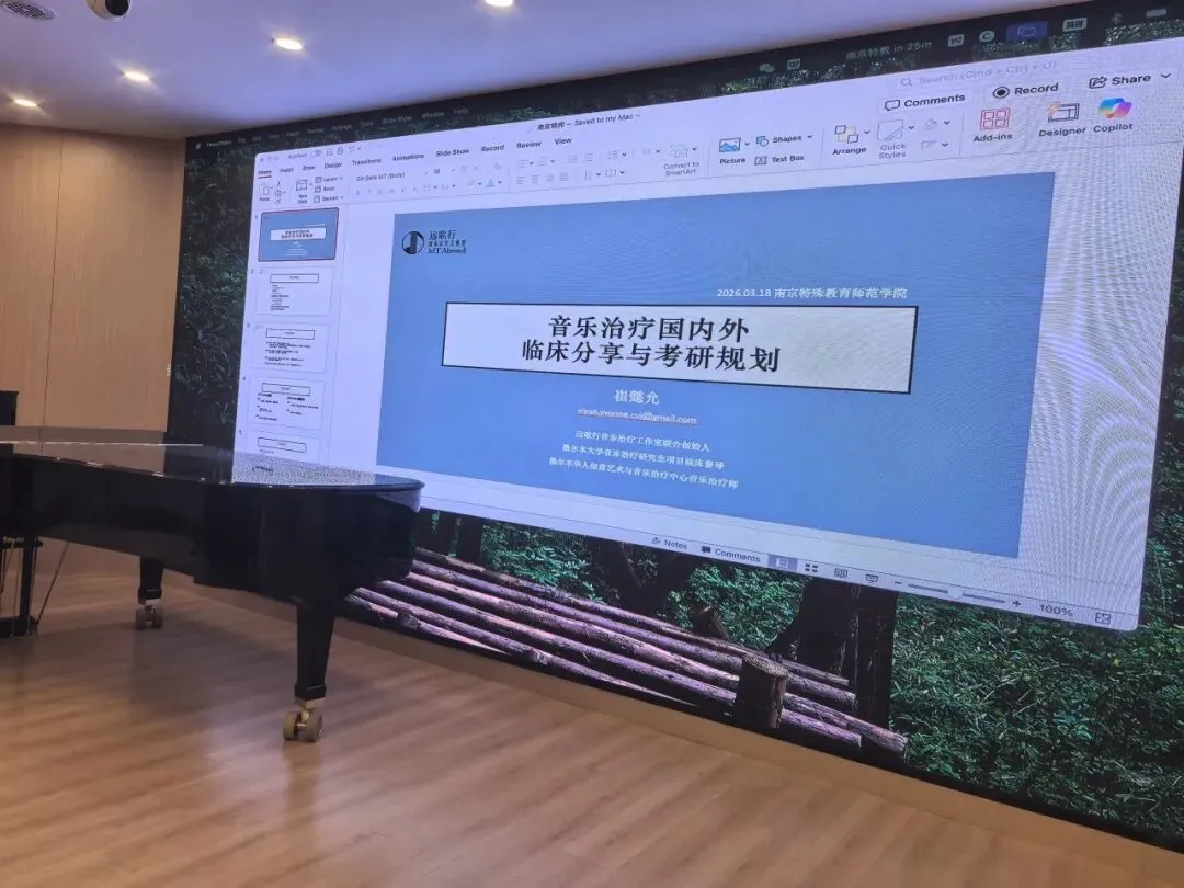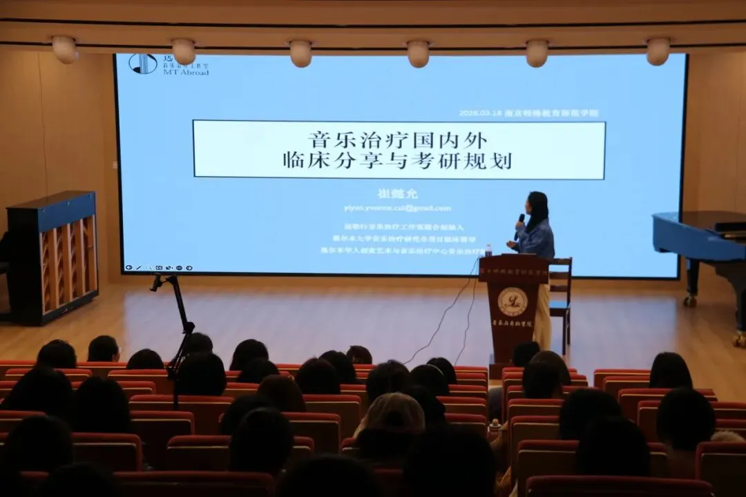 2026年3月18日,由南京特殊教育师范学院音乐与舞蹈学院主办的「音乐治疗国内外临床分享与考研规划」专题讲座在博韵楼音乐厅顺利举办。