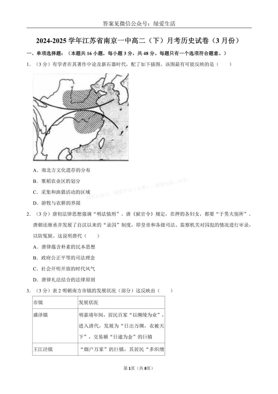 【南京】一中高二历史月考试卷+解析版答案(25年3月)