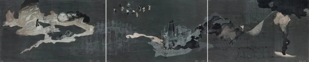 王启凡的《时空沙盘》可视为一个典型的符号重组与意义重构的案例。作品借以深色背景来凸显“传统符号”——云,并构建视觉趋势,但这非简单回归传统,而是通过建模“工作线”对既定符号进行形式解构,并在解构过程中生成异质化的图形样式。这种手法不仅打破符号原有的语境,也赋予其新的视觉与观念。作品中强行介入的“饾版”人物,其功能并非延续传统田园诗学的静谧表达,而是指向艺术家自觉建构的时空冲突现场。正如王启凡所言,该作品“摘取不同文化历史时期中的视觉符号,以沙盘游戏的形式重组,在符号的交错并置中,试图呈现中华文明内部劳作仪式与科技理念的更迭与建构过程”。因此,《时空沙盘》可看作是一场通过符号拼贴与场景模拟展开的文化叙事实验。