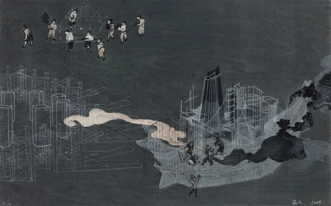 这一实践也呼应着近年来水印木刻领域的语言转向,从自然风物的惯性表达,逐渐转向对社会现实的关注,并在“水性”语言体系中融入铜版、石版等其他版种的视觉语法。在这种技术语言交汇与主体立场逐渐清晰的背景下,王启凡所采用的“沙盘演绎”模式,正可视为形式更迭与符号重释的一个起点,它既承接了媒材自觉与技术融合的趋势,也在AI时代语境下,试探着视觉符号在跨时空重组中所能承载的叙事潜能与批判张力。