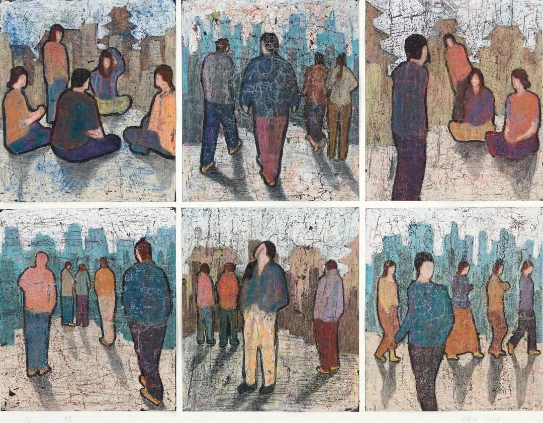 刘沐时的丝网版画作品以三联形式呈现场面宏大,大尺度的画面表现,将直面而来的年轻人刻画得淋漓尽致。作品透视关系呈二维形态,使每一位人物都成为了主角。不同造型、不同气质,透露着青年人在新的时代朝气蓬勃、胸怀大志、勇于探索、不懈追求的精神气象。构图形式新颖大胆,有一种充斥着画面的无限扩张感。作品使用丝网版画的多版套色,很好地体现了创作者精湛的丝网版画技术,将如此宏大的场面与细节的展现几尽完美。从构图到形式、从造型到印痕语言表达,都达到了令人期待的高度,可谓精品。