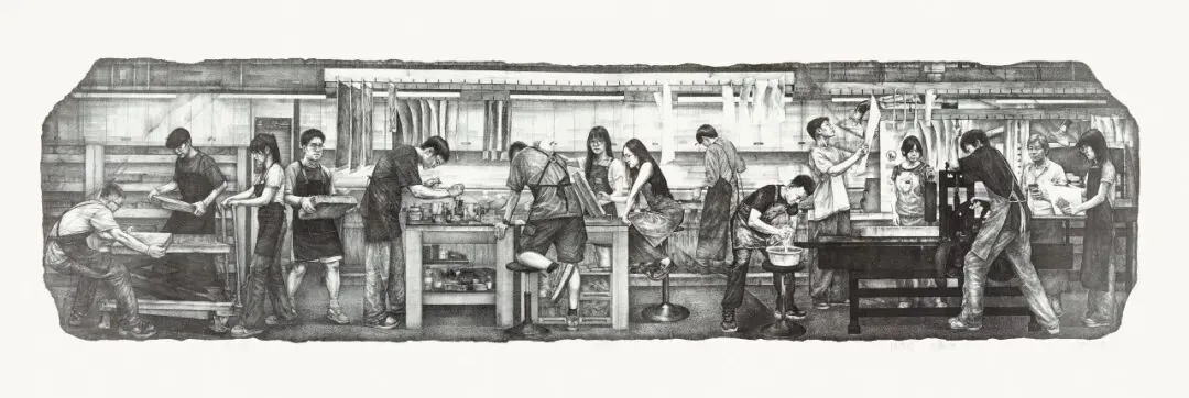 画面以长卷全景构图,资深艺术创作者与年轻力量同框,凸显协作劳动的当代价值,真实记录着新时代工匠精神的内涵。作品动人之处,聚焦在平凡劳动者:以细腻的笔触捕捉专注、默契与生动的生命状态,用黑白灰的理性语言褪去色彩修饰,直抵艺术创作自我价值的精神路径。