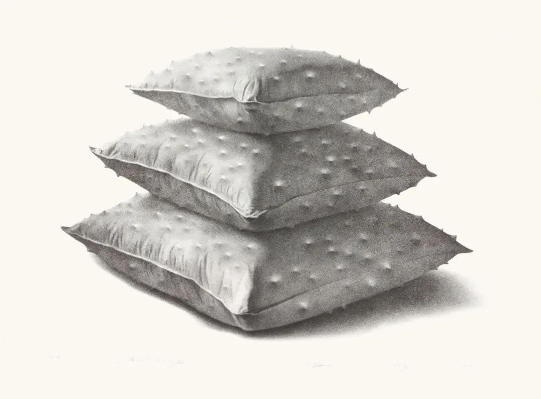 武艺画的那三只枕头规整地摞着,遵循着视觉稳定的古老法则——大的在下,中的居中,小的在上,仿佛一座微缩的金字塔,静默地传递着依偎与安宁的承诺。枕头,这夜复一夜承托我们最无防备时刻的伴侣,本应是温柔的乡、绵软的岸。然而,当视线攀上这安稳的结构之巅,看到的却是一片荆棘丛林——无数尖锐的刺,冷酷地自那本该最驯顺的织物表面刺出,撕裂了所有关于舒适与安全的想象。这便是“具象与抽象”在此处惊心动魄的交融。具象的是我们熟稔到几乎忽视的日常之物:枕头的形态、摞放的秩序、织物暗示的触感。抽象的是那匪夷所思的“刺”,一种超现实的、观念的强行植入。正是这二者的并置与冲突,让画面瞬间溢出表象,成为一面照见生存悖论的明镜。我们看到的,已非物件,而是隐喻。那尖刺,分明是人类心理防御机制冷酷而倔强的外化。我们何尝不是如此?在生命的旷野上,不断用理智、经验、世故甚至冷漠,为自己柔软的真心编织一层层带刺的甲胄。刺,生于对伤害的预判,长于对脆弱的恐惧。枕头与刺的共生,揭露了一个令人不安的真相:我们最私密、最渴望放松的所在,恰恰可能是防御工事最为森严的堡垒。那刺,既指向可能的外来侵扰,又何尝不会在辗转反侧间,刺痛依偎其上的我们自己?