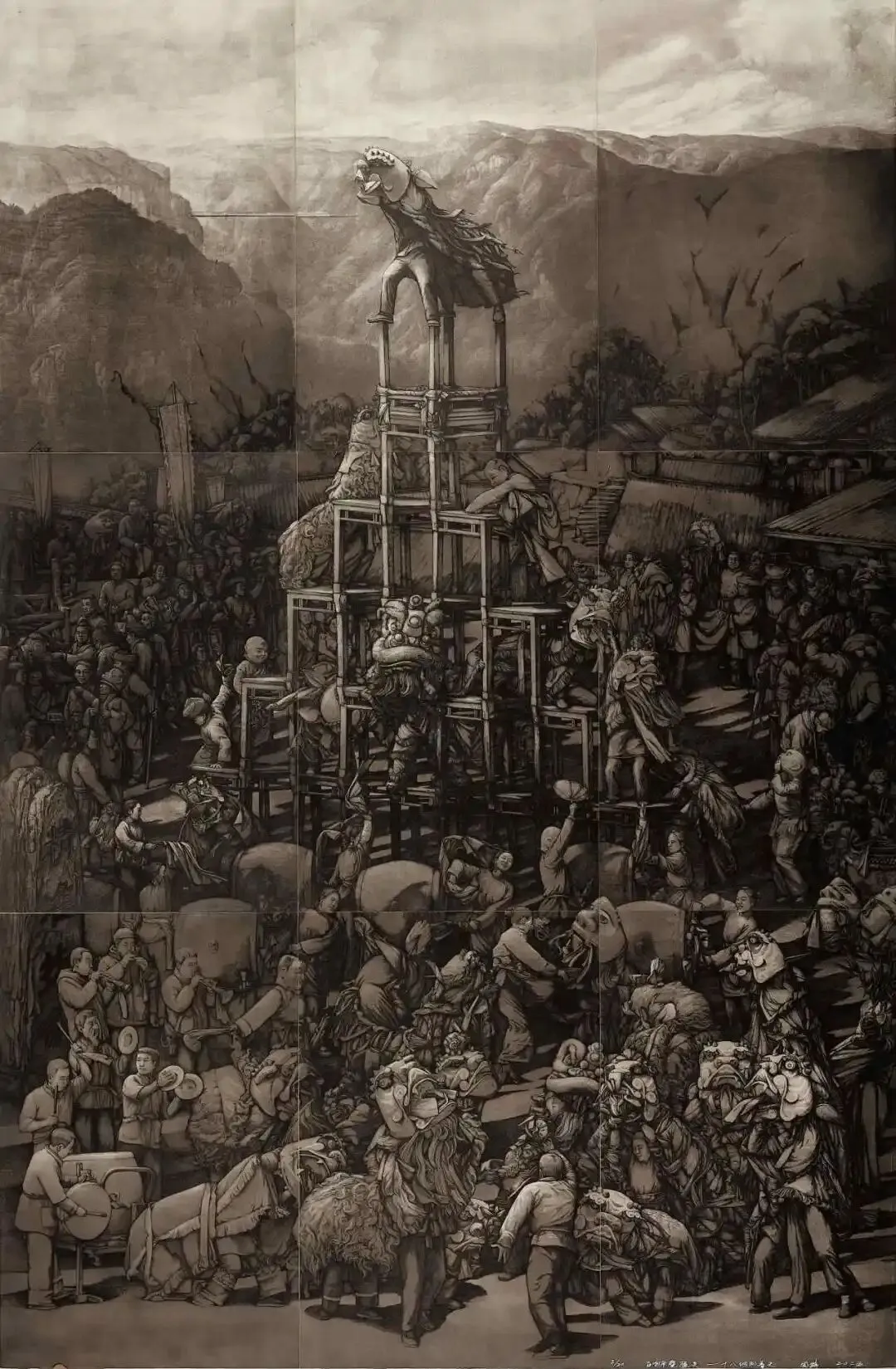 《百狮贺振兴——十八洞的春天》的作者透过铜版画印痕媒介,呈现出湘西苗乡生活的深刻变迁。