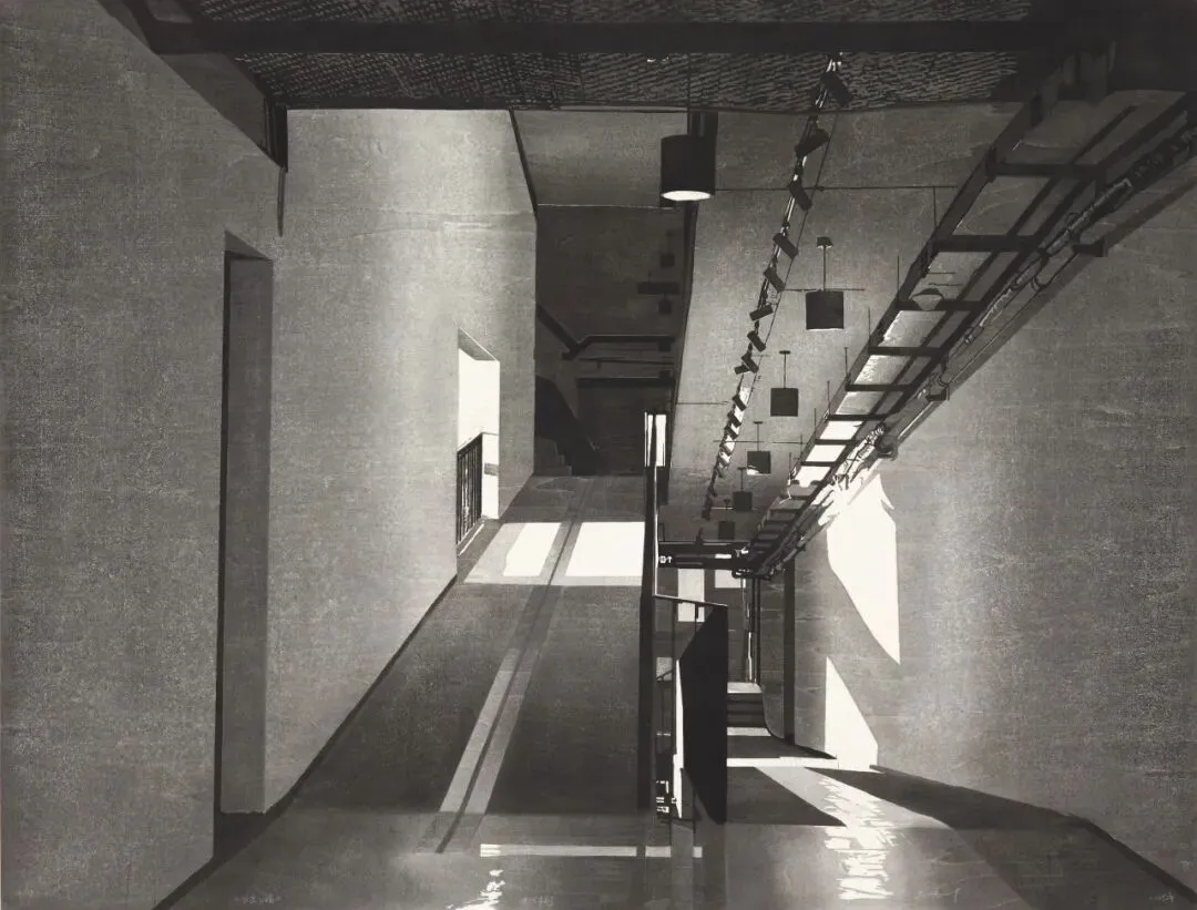 董敏洁的水印版画《分岔之境》描绘了现代建筑中两条空无一人的走廊,其一向上延伸,指向隐秘的黑暗;其二在平面上延伸,指向不确定的光亮。
