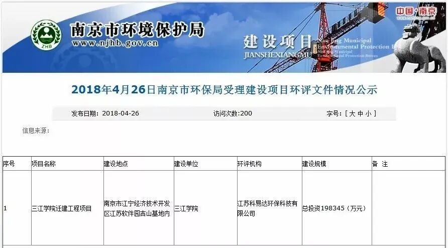 2018年4月,三江学院迁建工程的环评公示显示,三江学院迁建工程计划2018年10月开始建设,总投资超19.8亿元。