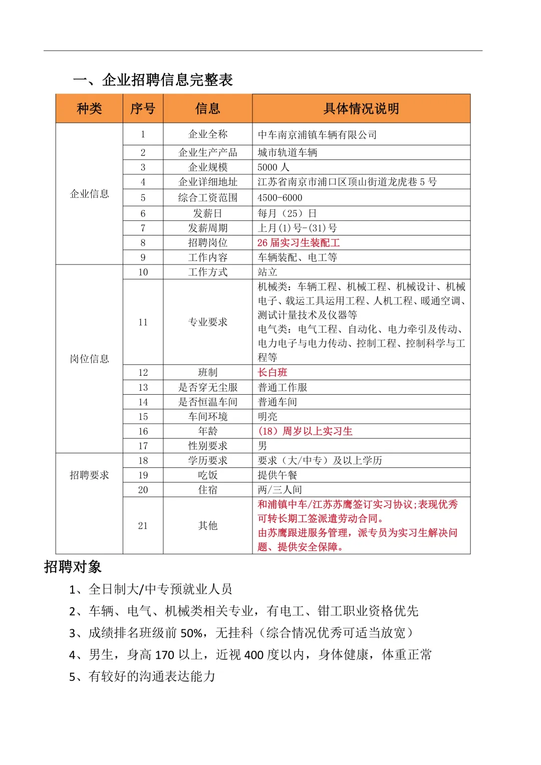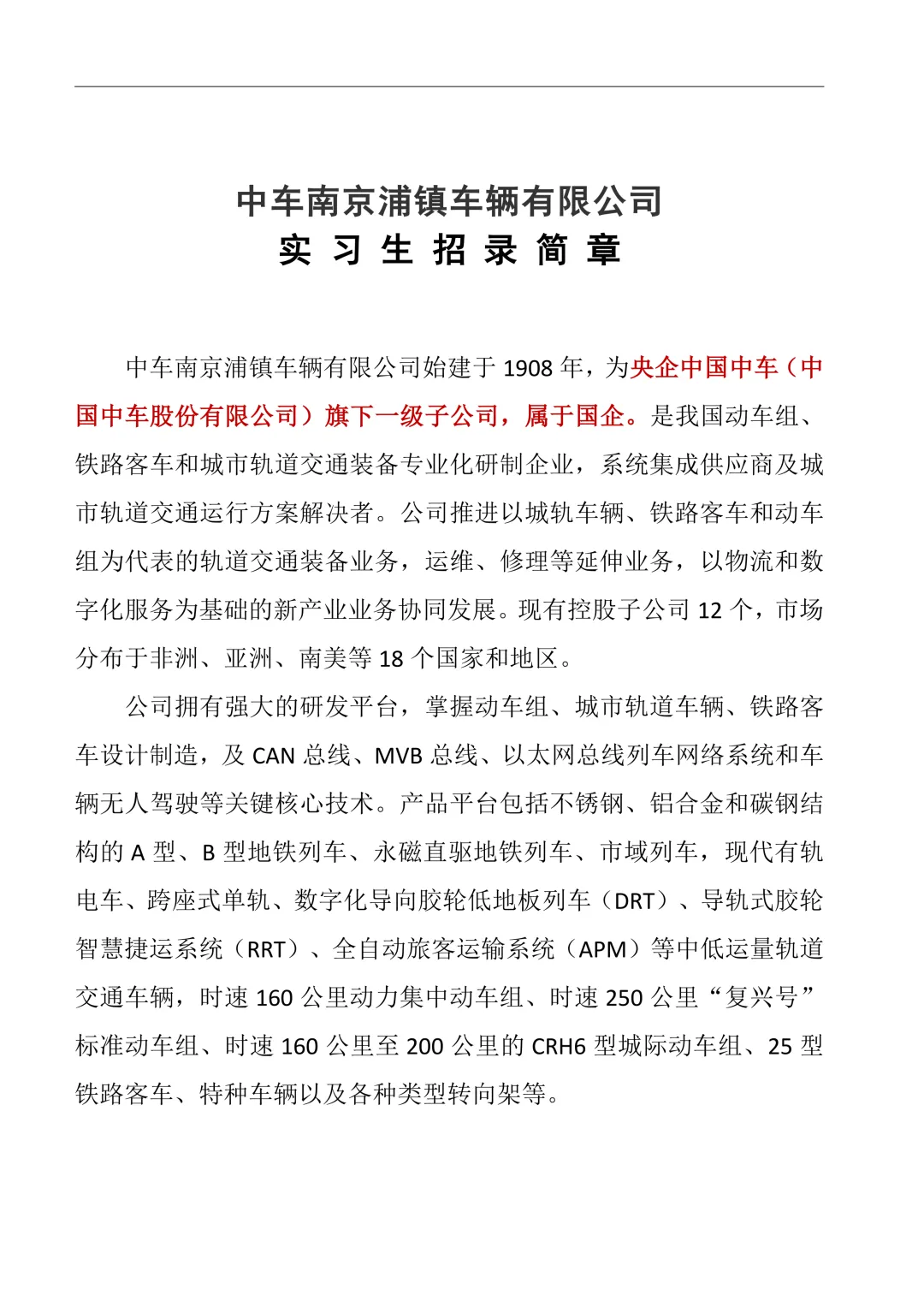 >校园招聘:中车南京浦镇车辆有限公司实习生招录简章