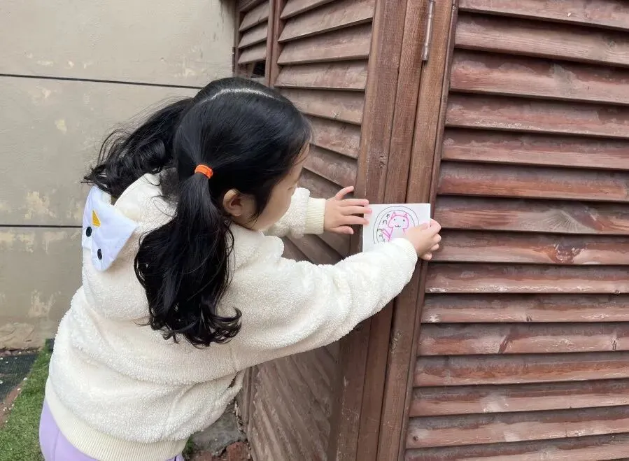 涂好之后,我们小心翼翼地把节水标志剪下来,跟着老师一起,把它们贴在幼儿园的水龙头旁、饮水区、卫生间,提醒每一位小伙伴:要节约用水,不浪费一滴水哦!