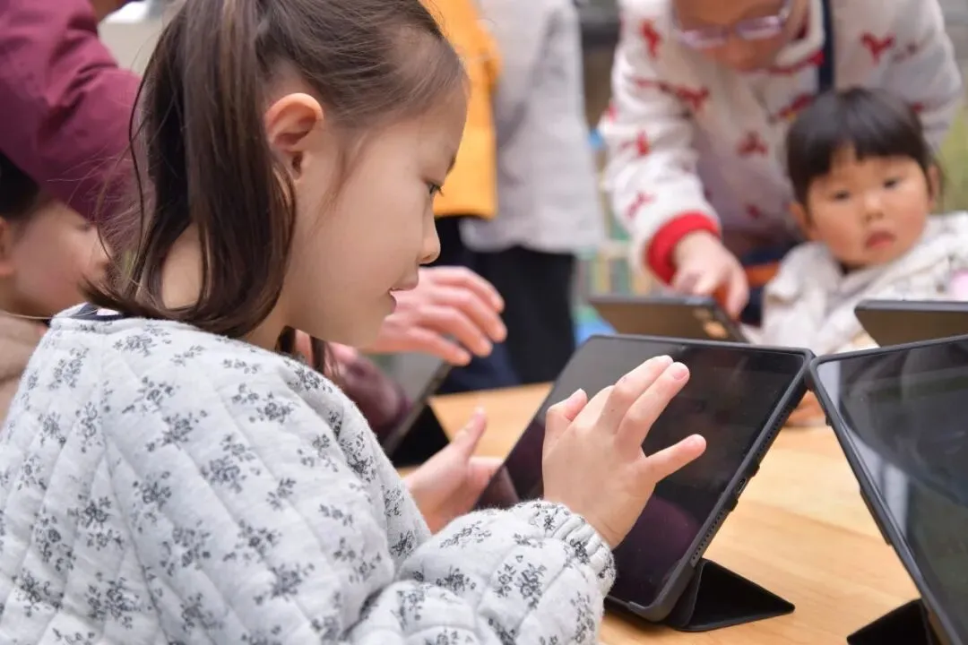 中班的小朋友发现屏幕上的小河里飘着好多垃圾,有塑料袋、饮料瓶,小河都“难过”了!大家伸出小手,触摸大屏,一点点把垃圾“捡”起来。