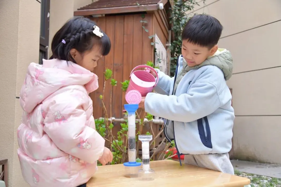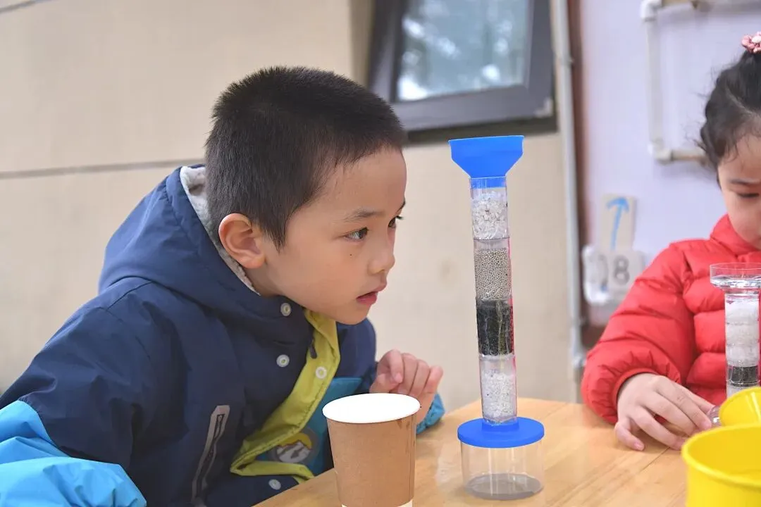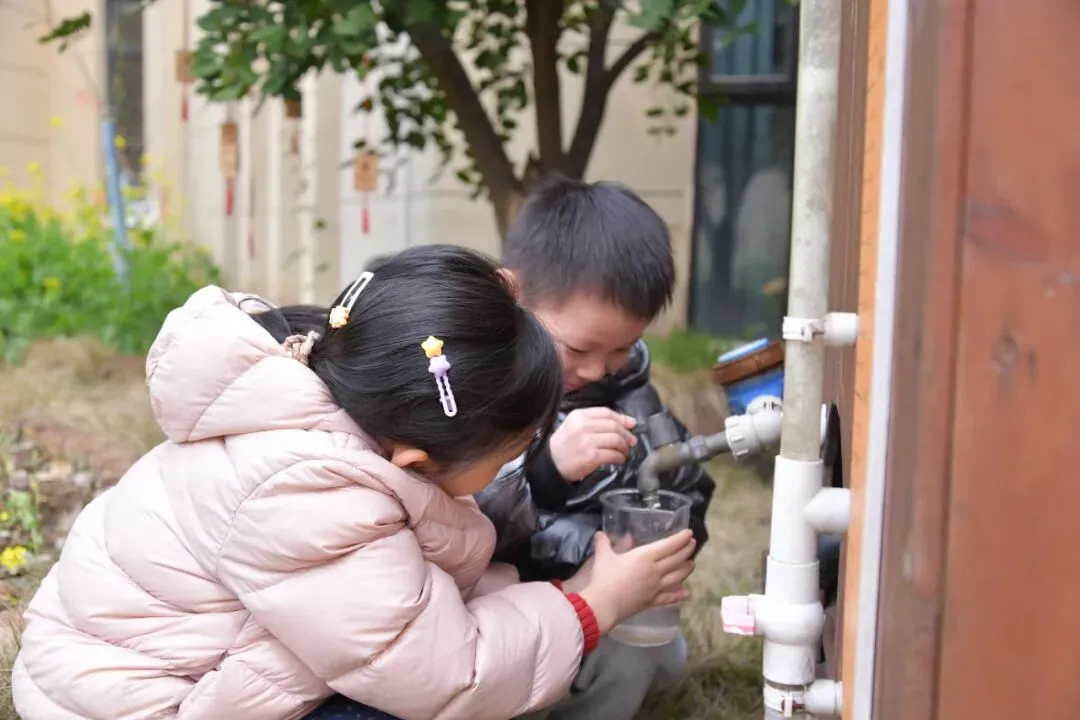 大班的哥哥姐姐,来到幼儿园的雨水收集器旁,开启了神奇的水过滤实验!我们先观察收集起来的雨水,发现里面有小小的杂质,看起来有点浑浊。