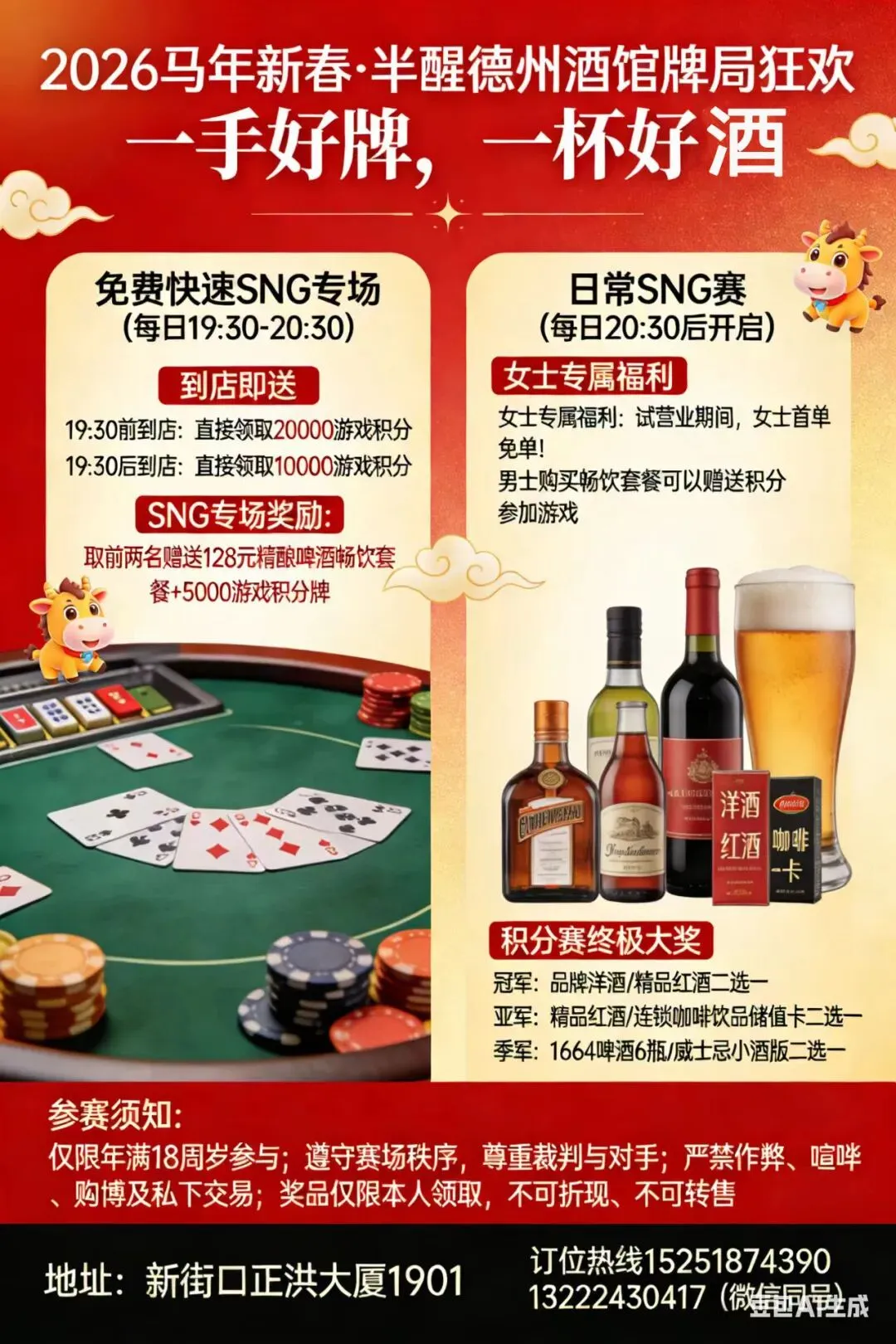 春光正好,尽兴正当时,半醒德州酒馆已为你备好一场「牌逢对手,酒遇知音」的狂欢盛宴 ——这里有专业美女裁判团队全程执裁,更有全新特调鸡尾酒上新,全场免费参赛,以牌会友。当一手好牌遇上一杯好酒,我们在新街口正洪大厦1901,等你赴约!