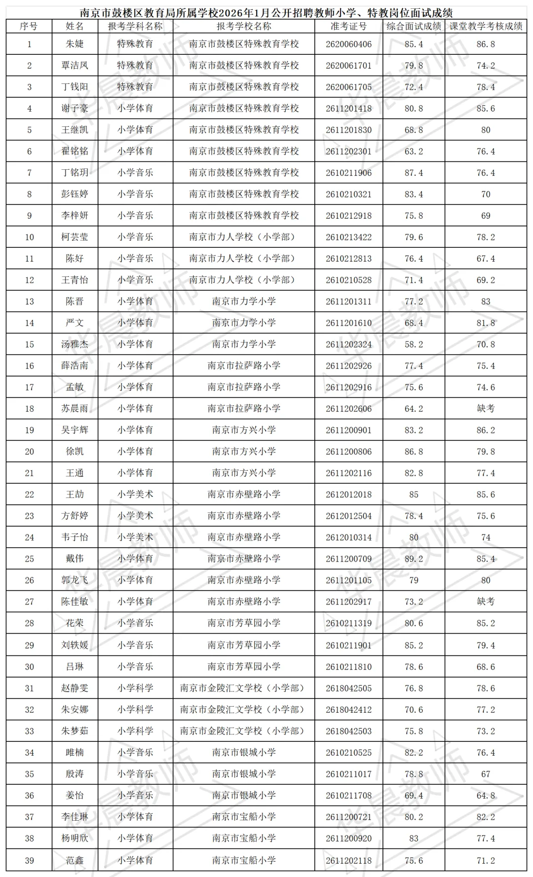 根据《南京市鼓楼区教育局所属学校2026年1月公开招聘新教师公告》精神,现将小学、特教岗位面试成绩公布如下,详见附件。
