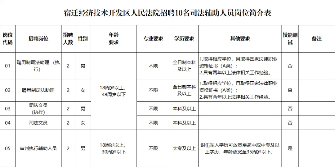 招聘岗位、计划招聘人数及相关资格条件详见《宿迁经济技术开发区人民法院公开招聘10名司法辅助人员岗位简介表》(以下简称《岗位简介表》)。