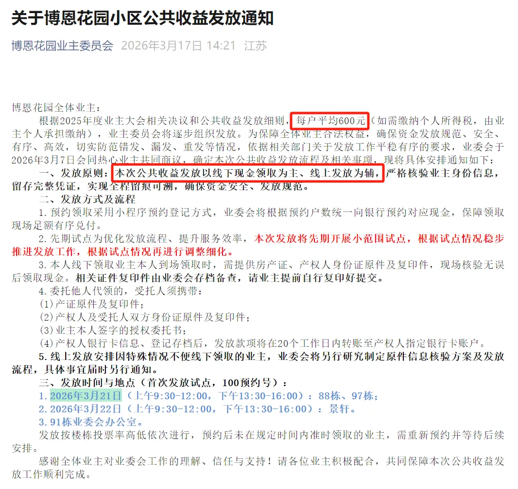 翠屏城业主们苦等多时的公共收益分红终于来了!根据公告,小区将以户为单位,每户统一发放现金600元,今天开始发放!