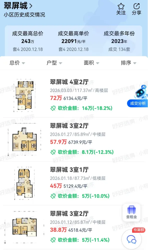 根据某二手房平台展示的数据,翠屏城二手房最高成交单价曾突破2.2万/㎡,小区近期成交均价约5447元/㎡,总价不到50万就能买到。