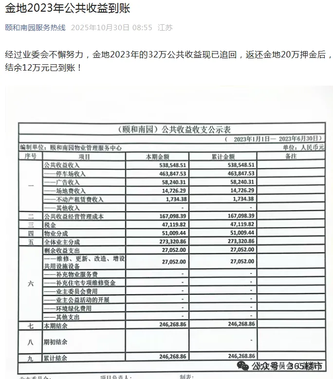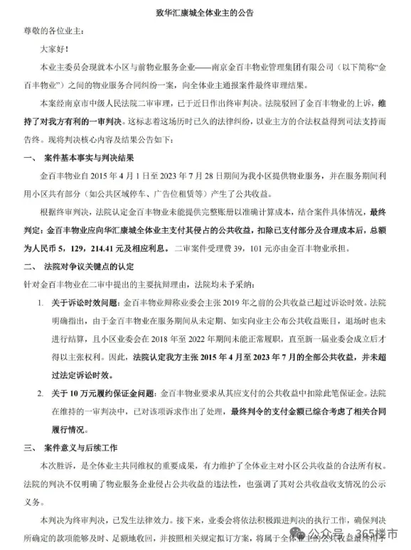 该小区业委会发布《终审落锤:南京金百丰物业需向全体业主返还公共收益5129214.41元及逾期付款利息》的通知。在全体业主和业委会的努力下,属于小区共有的公共收益终于被成功追讨回来了!