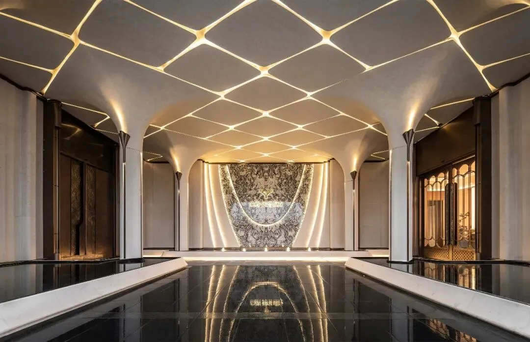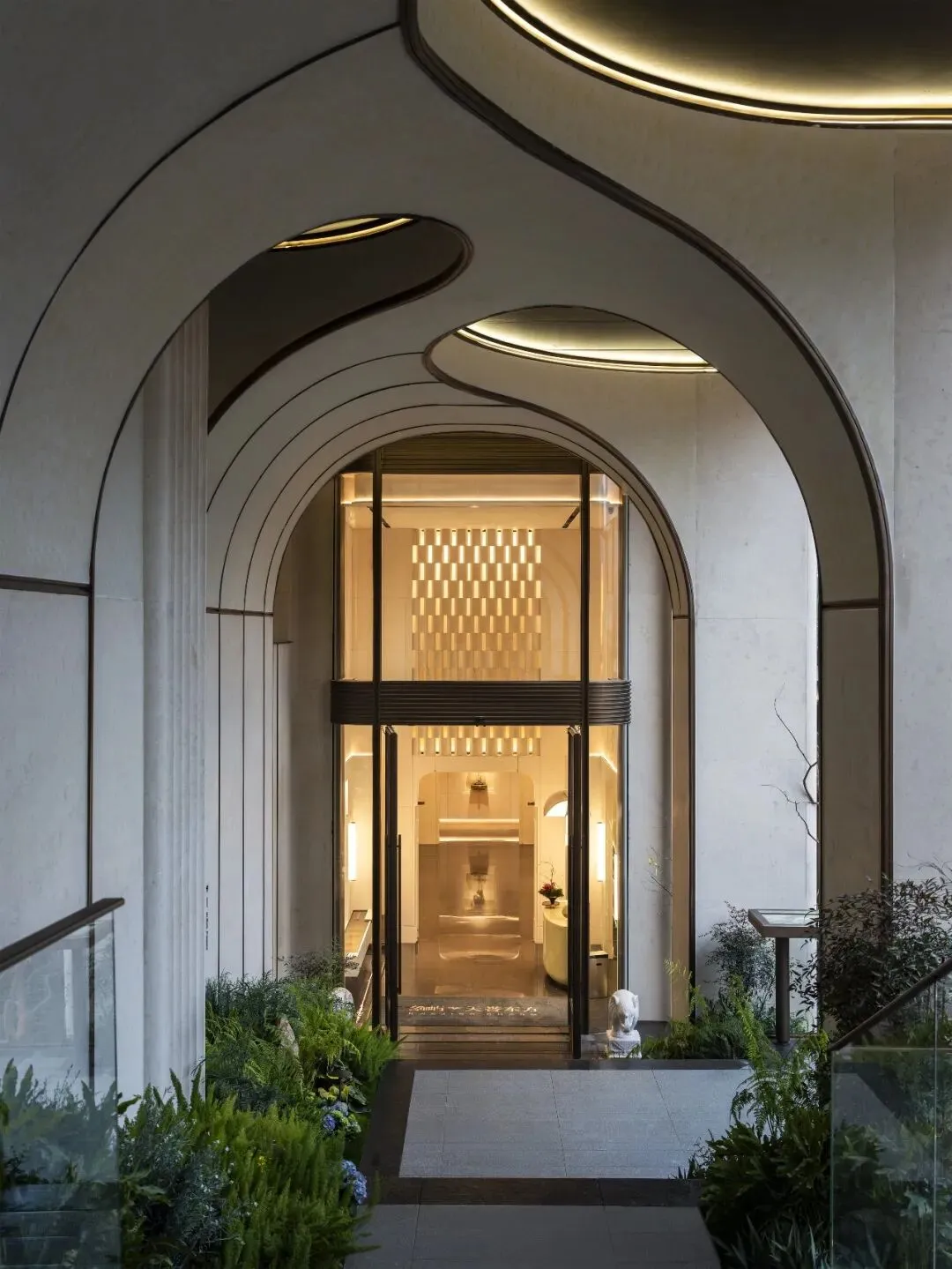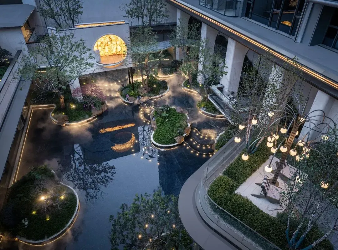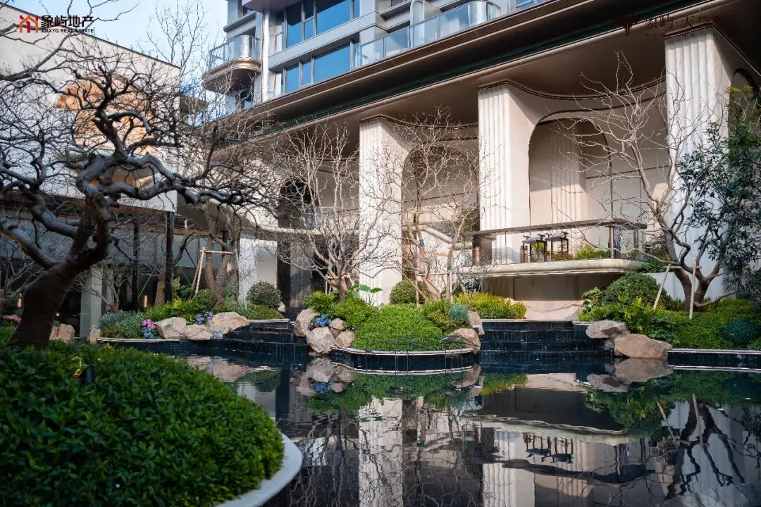 项目打造了多重归家礼序,层层递进,步步生景。穿过入口,一片镜面水景缓缓铺开,搭配进口奢石点缀、名贵花木环绕,随手一拍都是江南园林般的大片,这便是约2万方沉浸式园林的一角。