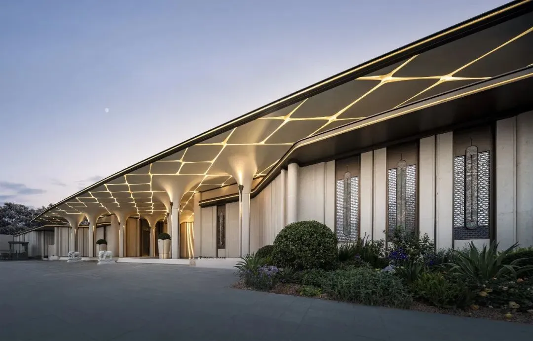 据了解,约75米超长风雨连廊两侧为维纳多石材,这是一种产自保加利亚的稀世珍材,材质地更加细腻,色泽均匀,外加米色的色调,给人一种高贵典雅的感觉。