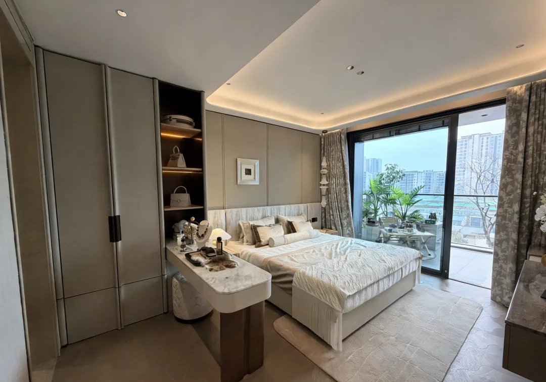 主卧采用套房设计,配备独立卫生间与步入式衣帽间,私密性拉满。卧室空间开阔,摆放大床与床头柜后仍有充足活动空间,飘窗设计增加了使用面积,可作为阅读角、休憩区,兼顾实用与浪漫。