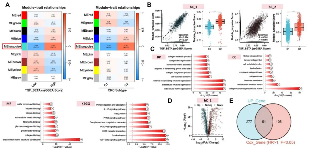 1)多组学整合与风险模型构建:对3,000例CRC样本的公共数据,使用单样本GSVA、共识聚类及WGCNA分析,筛选出与TGF-β相关的基因模块;结合机器学习算法,构建12个基因的TGF-β风险标记物(TGFRS)。