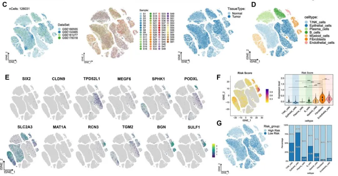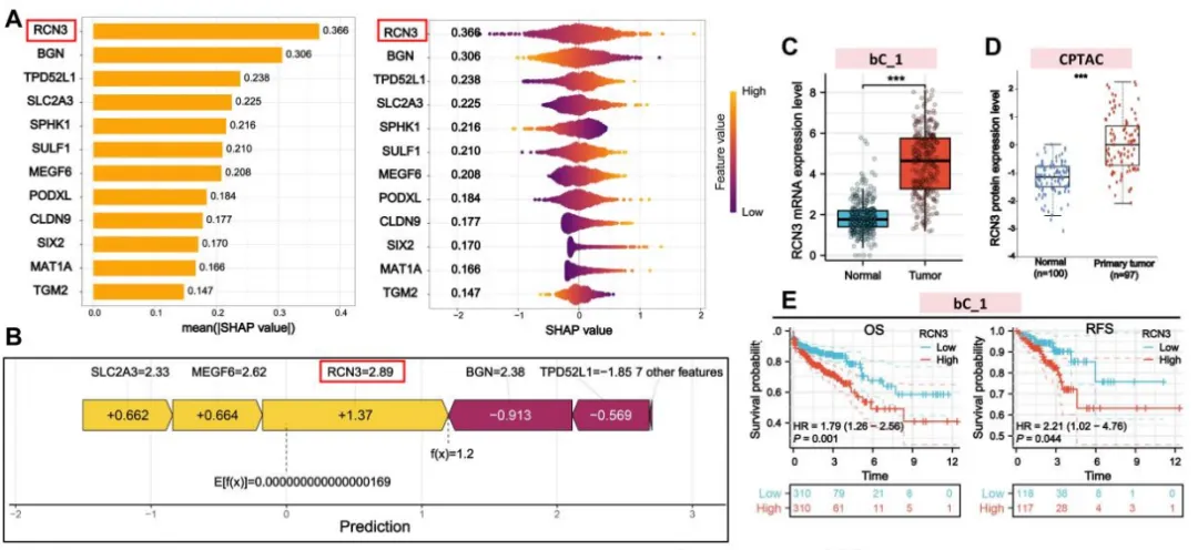 SHAP分析显示RCN3对TGFRS风险评分贡献最大。RCN3在肿瘤组织中显著上调,且几乎只在癌相关成纤维细胞(CAFs)中表达。其高表达与不良预后密切相关,提示RCN3+ CAFs可能是推动肿瘤进展的关键基质细胞亚群。