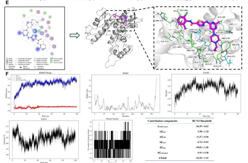 药物敏感性分析发现,达沙替尼(Dasatinib)对RCN3+Fib具有选择性杀伤作用,分子对接和动力学模拟证实其可与RCN3蛋白稳定结合。该结果为靶向RCN3+ CAFs提供了潜在的治疗策略,支持其作为联合免疫治疗的候选药物。