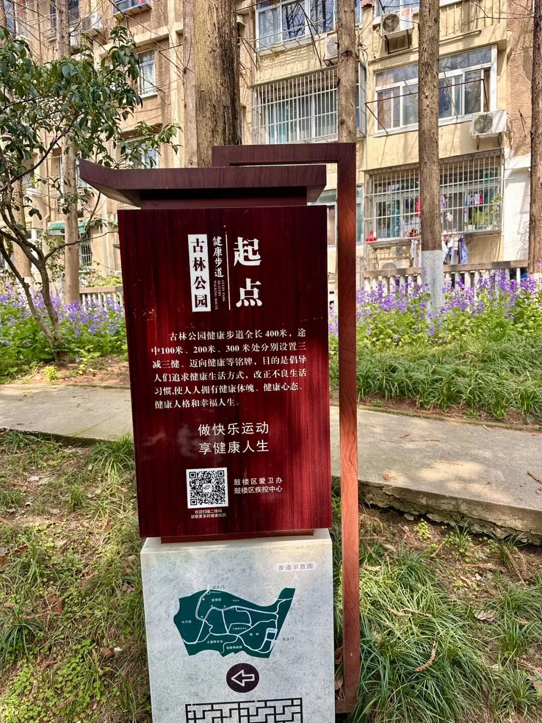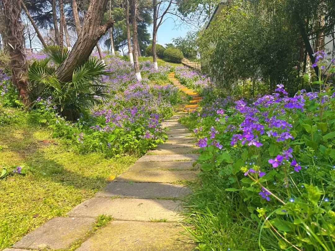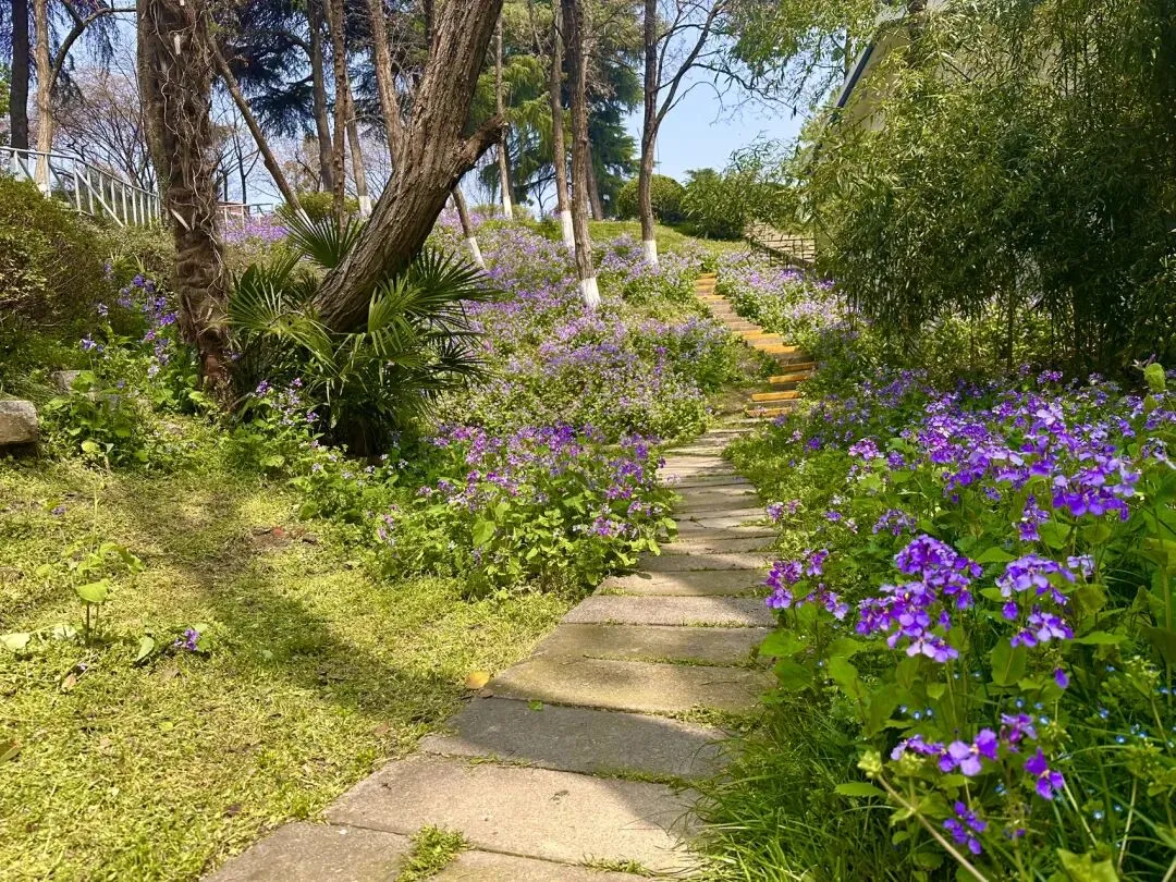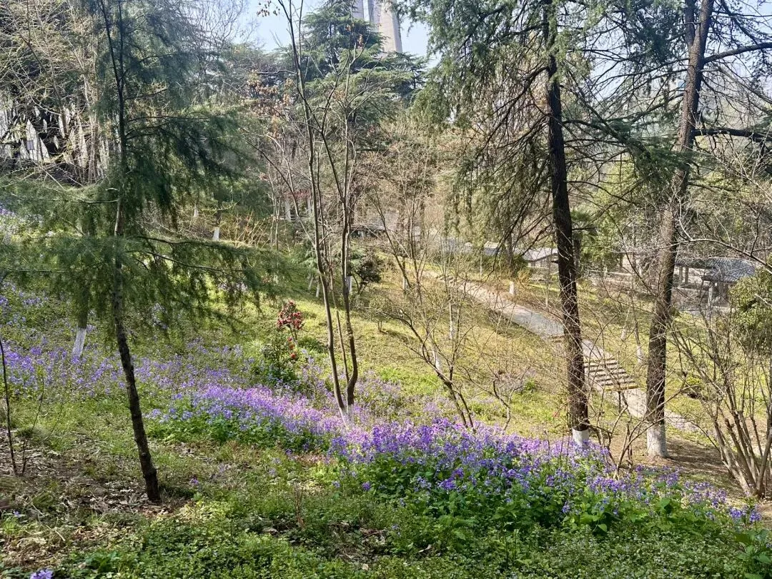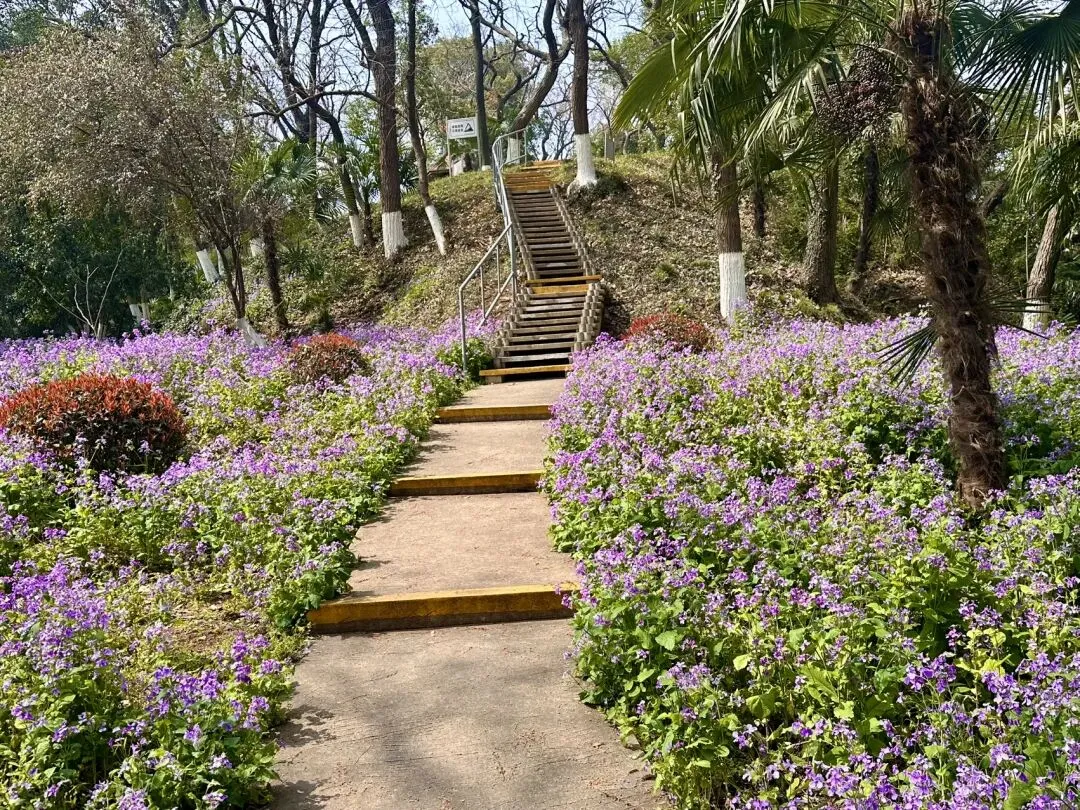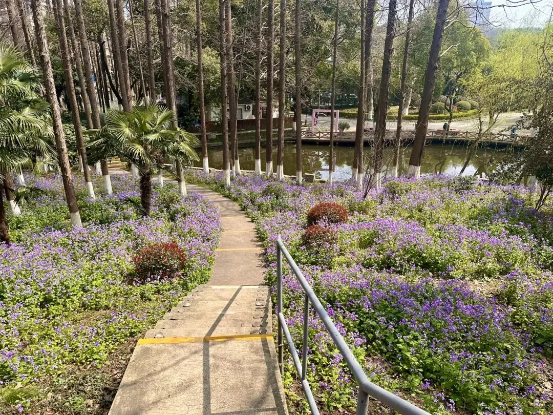 站在高处俯瞰,这满园的紫色,不仅掩盖了冬去的萧索,更映衬出古林公园“古”与“新”的完美融合。蜿蜒的徒步道如一条灵动的丝带,在紫色的花浪中若隐若现、穿针引线。