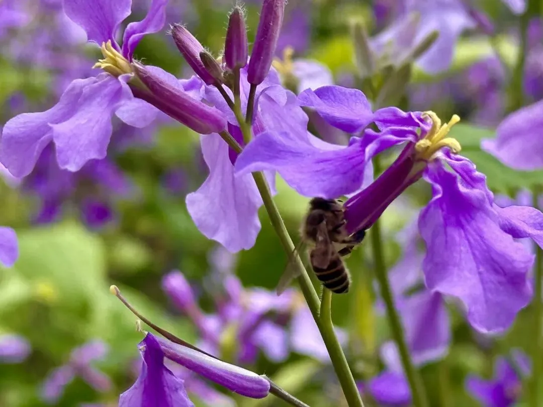 这里曾是古林寺的僧侣耕作与修行之所,如今却成了花海的世界。二月兰的四片花瓣呈优雅的十字形舒展,蜜蜂穿梭其间,忙碌地采撷花蜜。