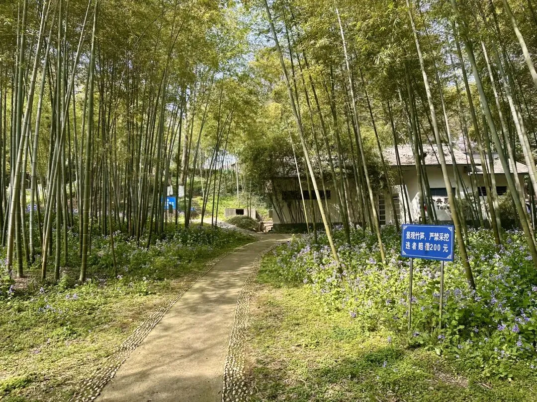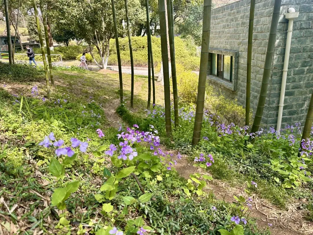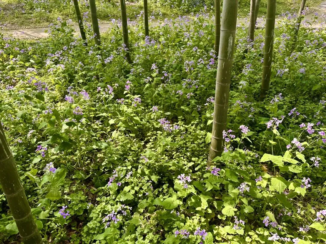 若是往日,这里多是翠绿主调,而今日,竹林之下竟也开满了二月兰。高耸的翠竹与低矮的紫花形成了绝妙的色彩对比,阳光穿过竹叶的缝隙,在花海上投下点点金光。