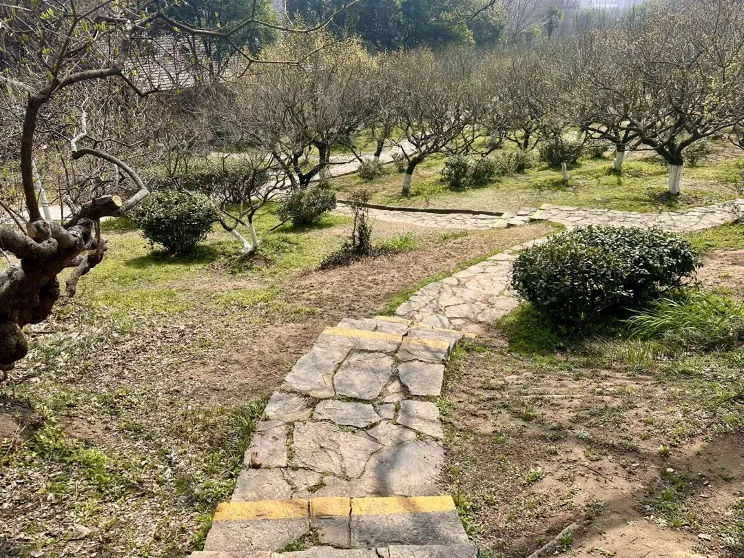 左手边有一个水塘,穿过水塘又是一个缓坡,拾级而上,再向右边的徒步道一直向前走,便来到了梅花山附近。