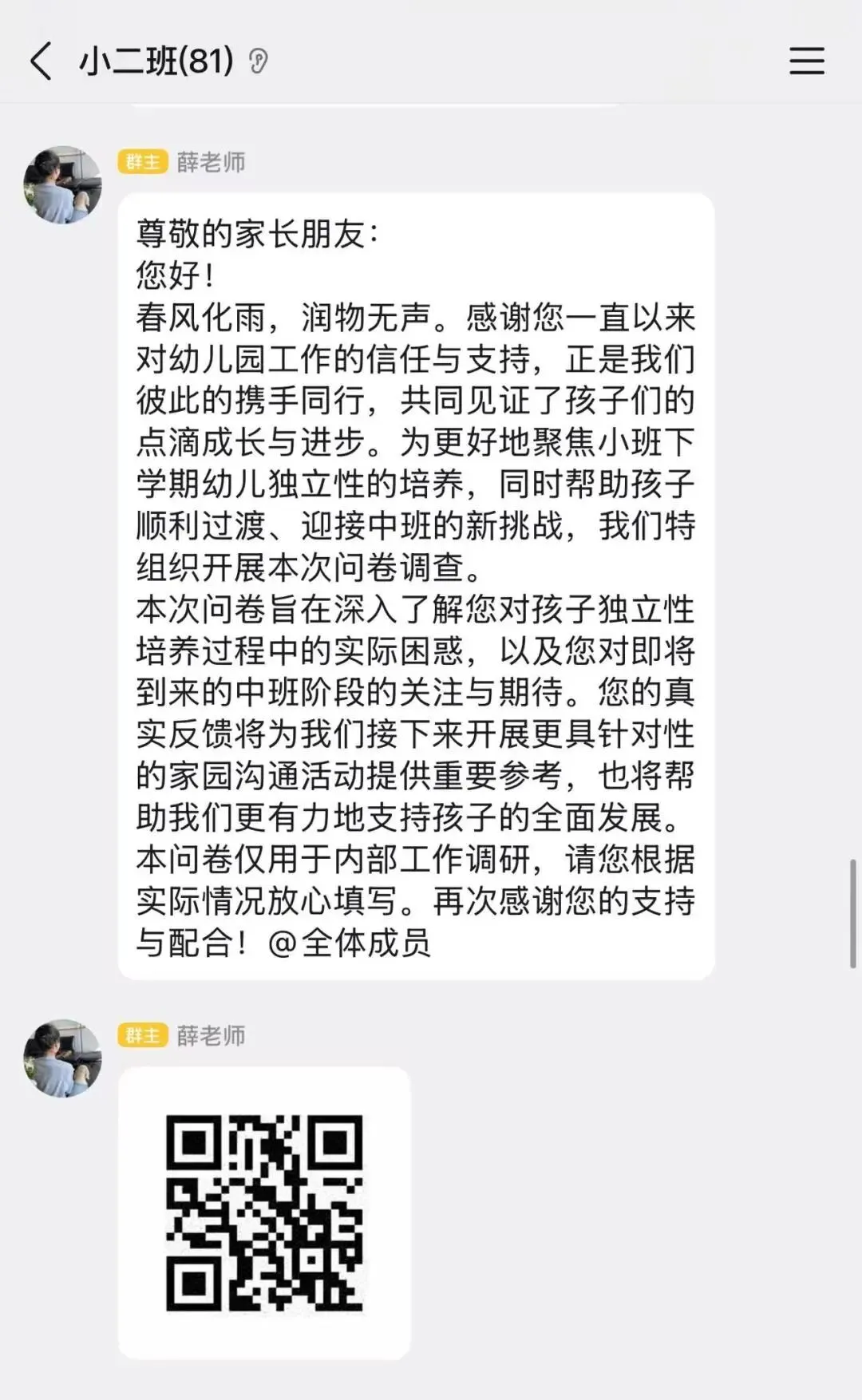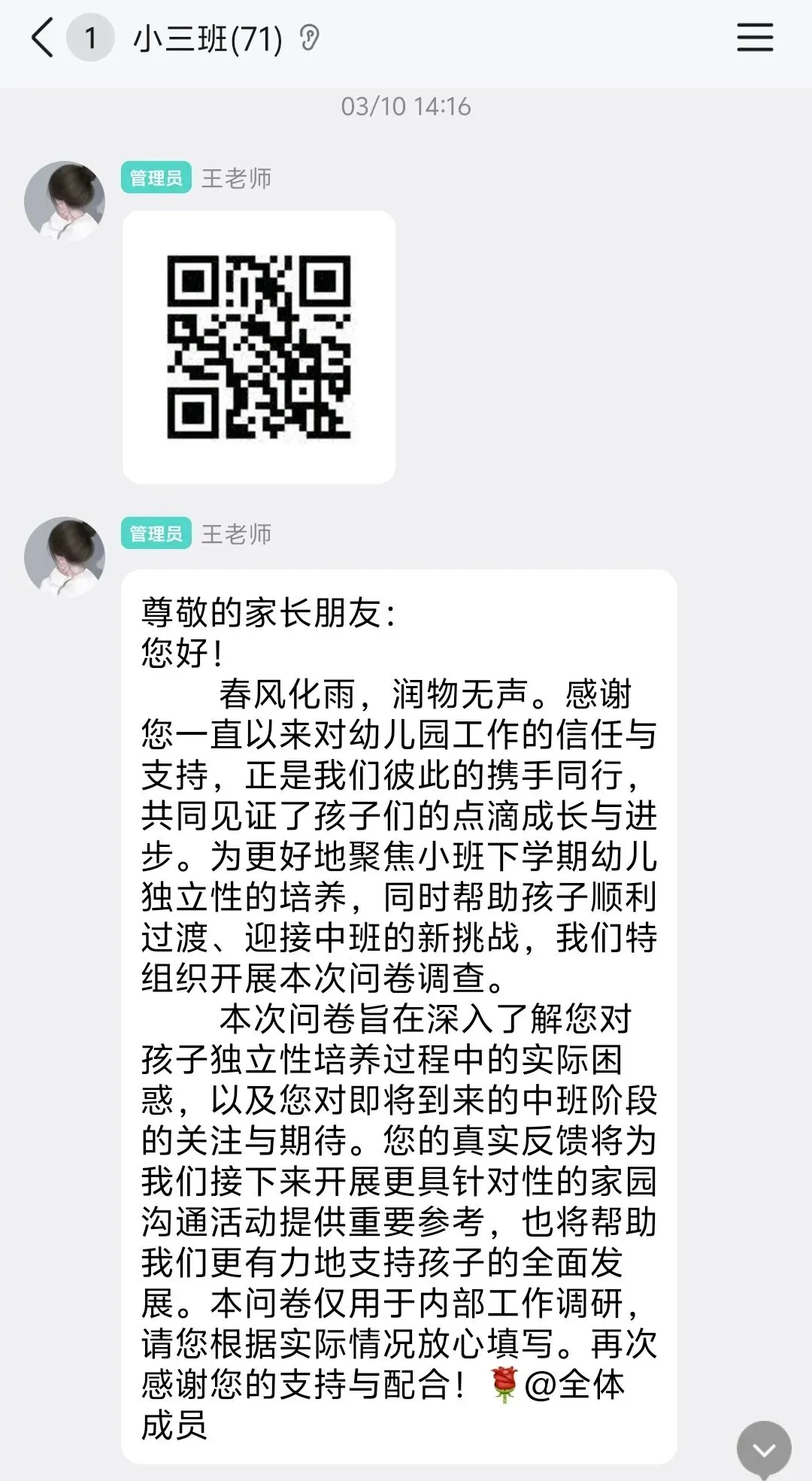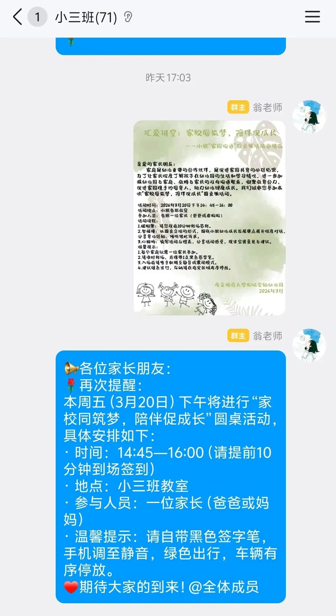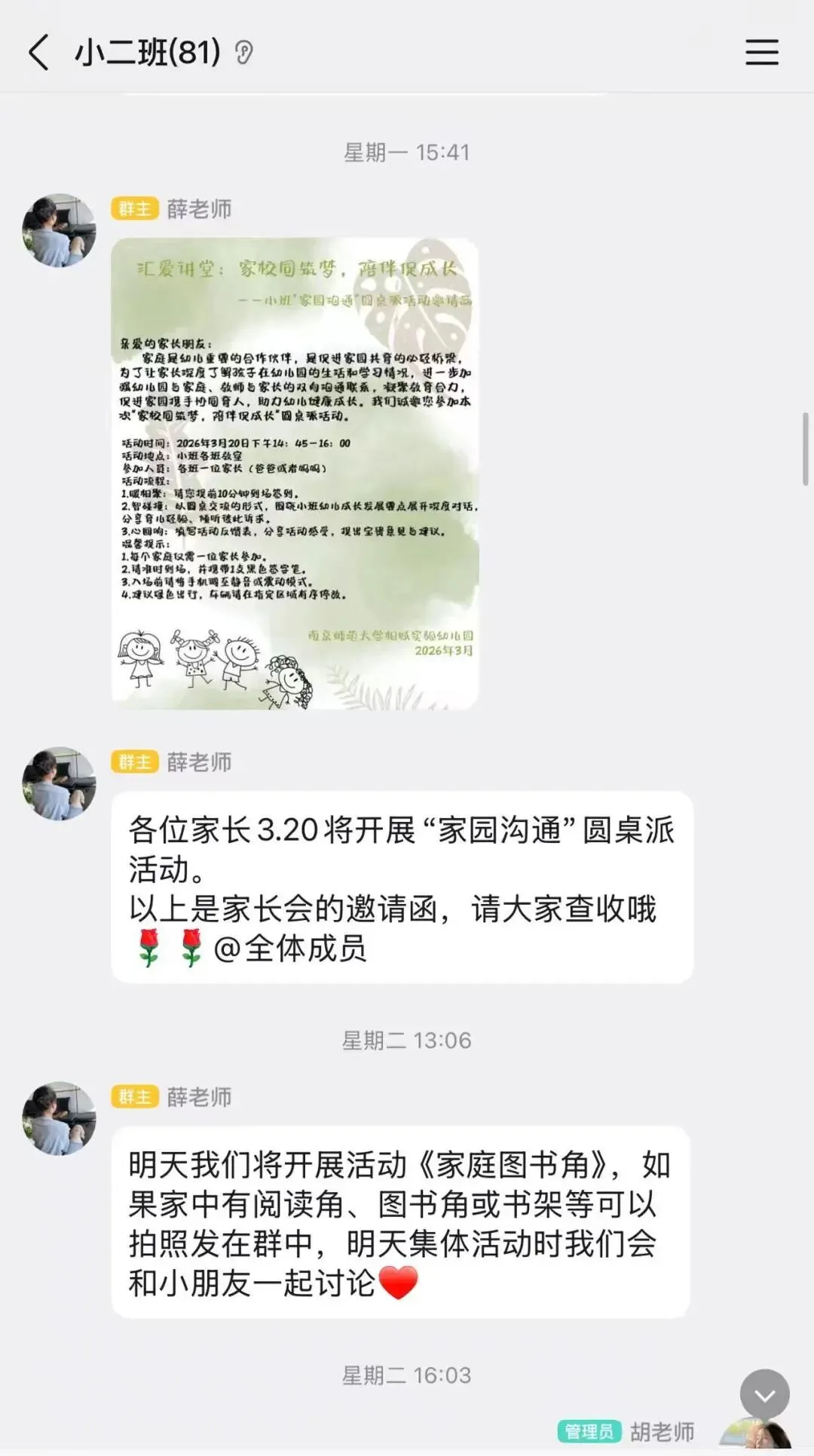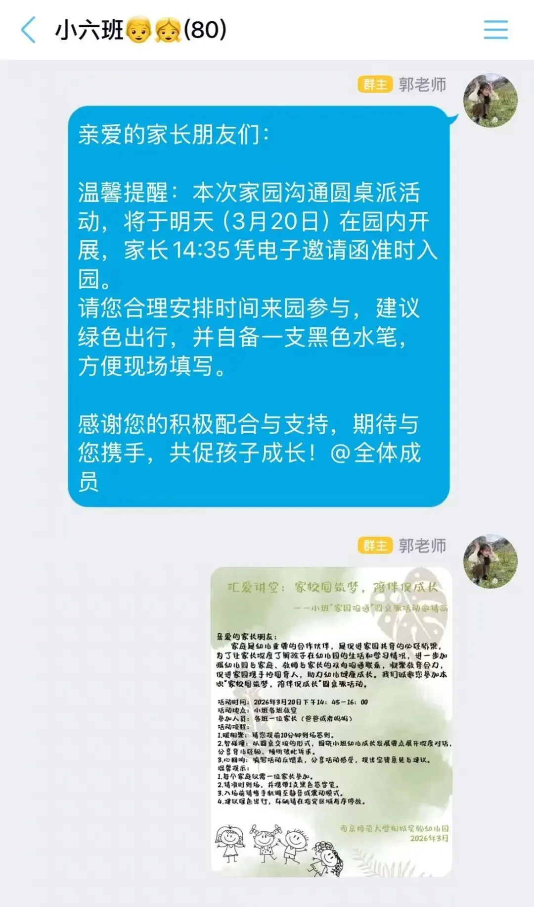 为确保圆桌派的顺利召开,小班老师提前给家长们发送了温馨的圆桌派邀请,便于家长们提前安排好时间,做好充足的准备,保障本次圆桌派的顺利召开。