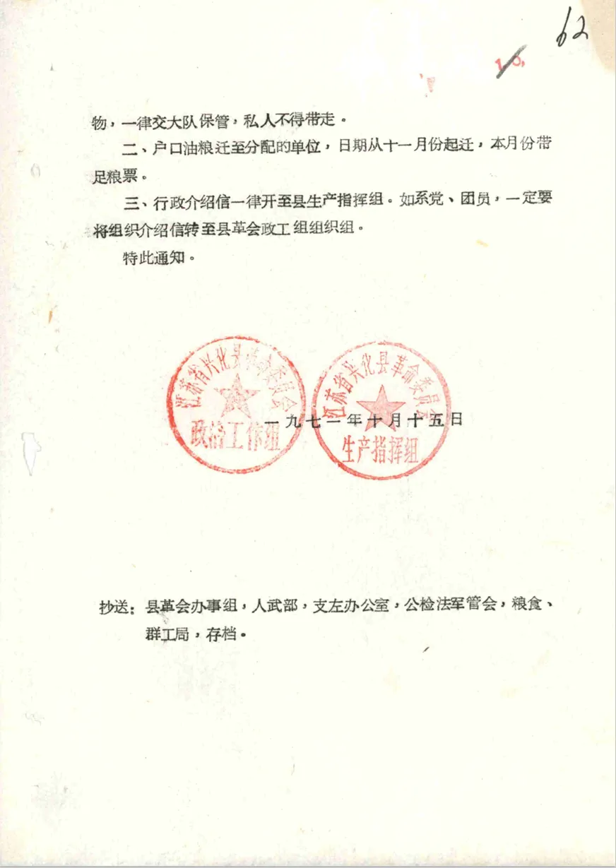 笔者在查找资料时,看到了一份1971年10月15日兴化县委发出的《关于招收刘付风等壹百名插队青年去南京、扬州分配工作的通知》。