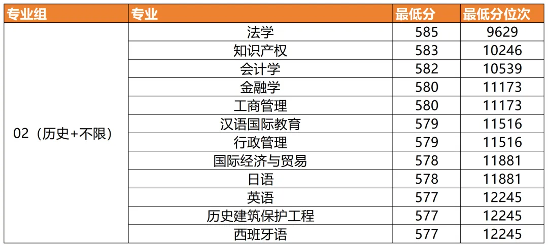 录取位次最高的前三专业:1. 法学—9626;2. 知识产权—10246;3. 会计学—10539最低录取位次专业为制药工程(中外合作办学),录取位次101162;