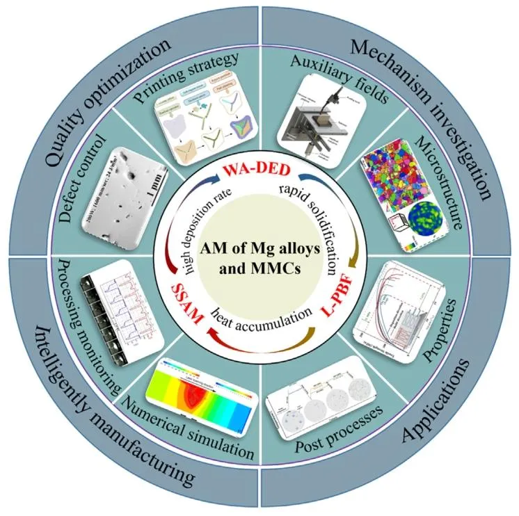 近年来,镁合金及镁基复合材料在先进装备、轻量化及生物医学工程应用中取得了显著进展。增材制造(AM)技术具有高灵活性和设计自由度,对于复杂结构高性能镁合金构件的快速成型具有重要意义。由于增材制造镁合金及复合材料的逐层沉积特性,其构件与传统工艺制备的构件相比,展现出独特的微观结构和性能。然而,镁合金及复合材料的增材制造技术在实际应用中仍面临原材料、工艺条件、后处理及工艺参数选择等方面的挑战。本文综述了采用多种增材制造技术(包括丝弧定向能量沉积 WA-DED、激光粉末床熔融 LPBF 和固态增材制造 SSAM)制备镁合金及复合材料的最新进展,系统探讨了工艺参数、成型质量、微观结构与性能之间的关系。重点研究了制造工艺和材料成分对腐蚀行为和生物相容性的影响,总结了场辅助增材制造和后处理在镁合金及复合材料缺陷抑制、微观结构演变和性能提升中的机制与应用。最后,展望了增材制造镁合金及复合材料的潜在应用领域,并提出了未来发展趋势。